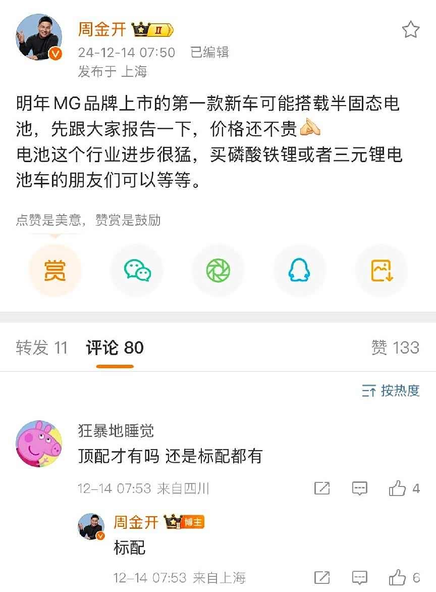 日前,上汽集团名爵品牌事业部总经理周钘在社交媒体上表示,MG明年上市的第一款新车可能搭载半固态电池,价格还不贵。并且在回答网友提问时,周钘表示,新车将标配半固态电池。