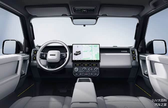 内饰设计和外观造型相匹配,运用了大量的平直线条,方向盘也采用双色设计,屏幕下方的圆形旋钮和方形的空调出风口给车内增添了几分复古的气息。