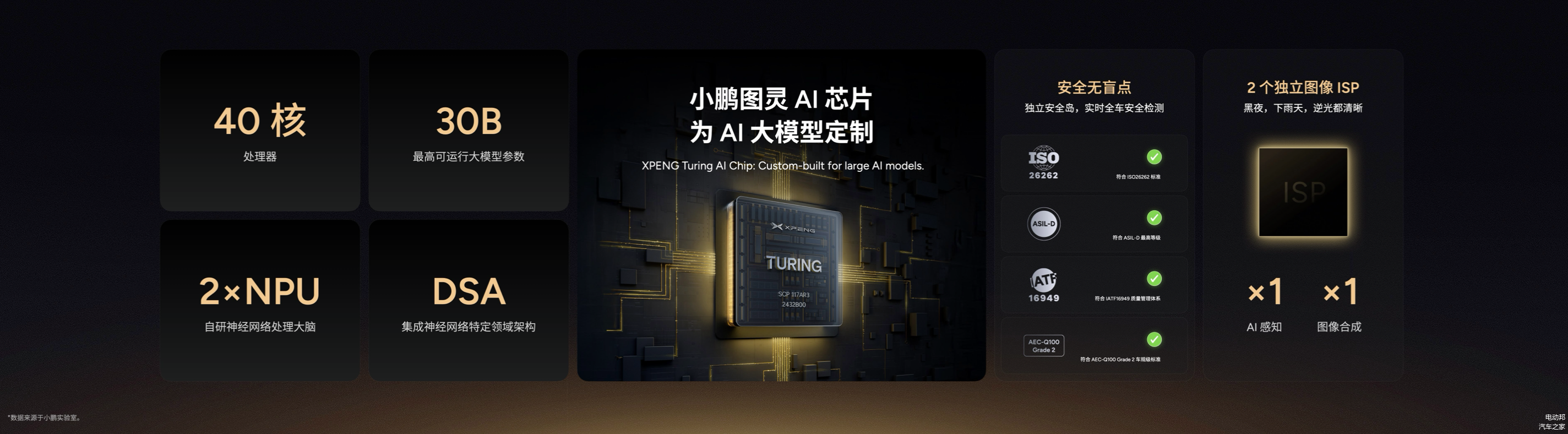 此外,「小鹏图灵AI芯片」将应用在小鹏汽车旗下的产品中,包括AI汽车、AI机器人和飞行汽车。官方还透露:『该芯片为AI大模型定制,拥有40核处理器,能够支持高达30B参数的大模型运行。』