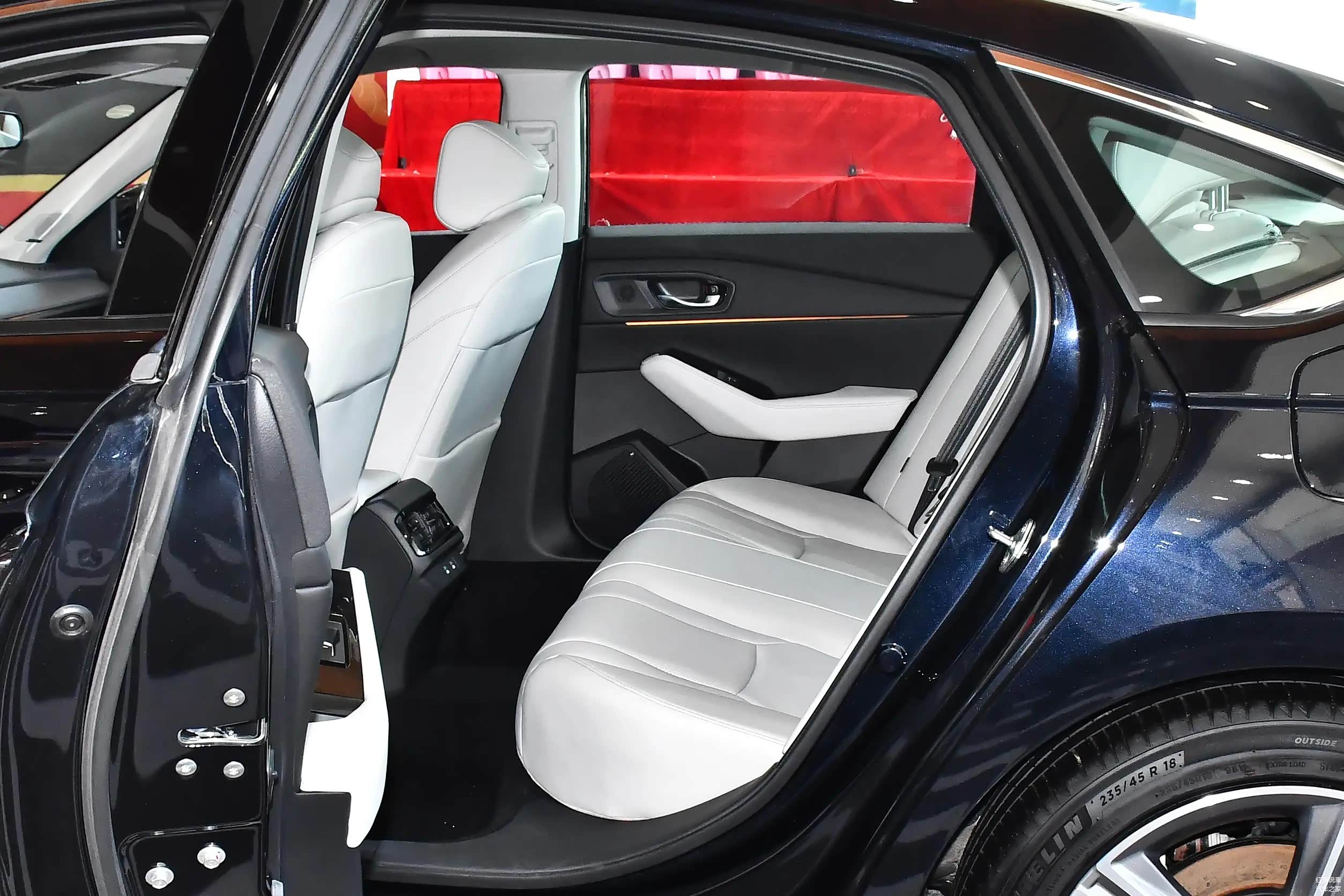 从侧面来看,本田雅阁 PHEV颇有些肌肉性能车的范儿,车身十分修长,性感的溜背车顶搭配轿跑姿态,带来了一定的运动感,侧窗上沿的镀铬饰条到了C柱位置形成了漂亮的勾角,而外后视镜具有加热、记忆、电动折叠、倒车自动下翻、锁车自动折叠功能,尾箱上面带有小型扰流板,再加上带扩散器的包围,进一步增强了运动气息,贯穿样式的尾灯融入了黑色饰板,中间位置的“H”车标比较精致,灯组点亮后还是挺好看的,尾门右下角的“e:PHEV”标识彰显着它插电混动的身份。