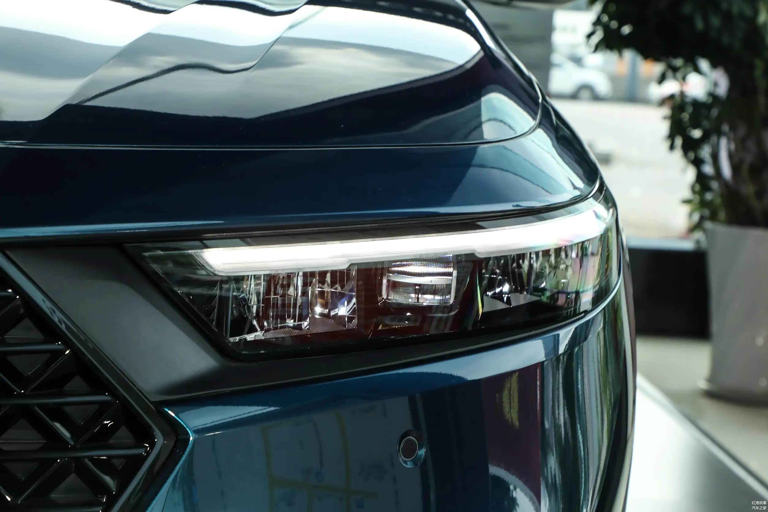 本田雅阁 PHEV在外观设计上和燃油版基本保持一致,但从细节上还是能够看出它插电混动的身份,车头十分的扁平低趴,前脸六边形的黑色进气格栅有点像黑武士的面罩,呵呵,“H”车标周围使用了蓝色装饰,象征着节能环保,而LED大灯扁平且熏黑,眼神中不经意间流露出几分犀利,在夜晚和经过隧道时会自动点亮,并且会根据路况和对面灯光情况自动转换远近光,车辆在转弯时转向辅助灯亮起,提升了照明区域。