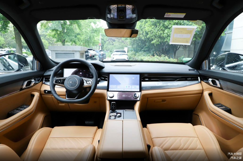 内饰方面:车内营造的氛围既现代又豪华,注重科技感的同时不乏应用大量考究材料提升品质感。而方向盘采用三辐式造型,握感无可挑剔,两侧的按键均为触摸式,触摸时有振动反馈。细节之处很到位,无论是铝制装饰面板还是旋钮上的滚花点缀,亦或是藏于深处的品牌标识,都令人赏心悦目。另外,中控台搭载了12.3英寸液晶仪表盘、12英寸中控屏和6英寸中控下屏,加入了12.8英寸全彩W-HUD抬头显示系统。配备LYNK OS和高通骁龙8155芯片,拥有12G+128G的内存空间,支持FACE ID无感登录,车联网、四音区语音交互和可见即可说等功能。此外,车辆还搭载了14扬声器BOSE高保真音响,搭配ANC主动降噪系统和流光珊瑚氛围灯,在车内能享受到沉浸式的音乐体验。