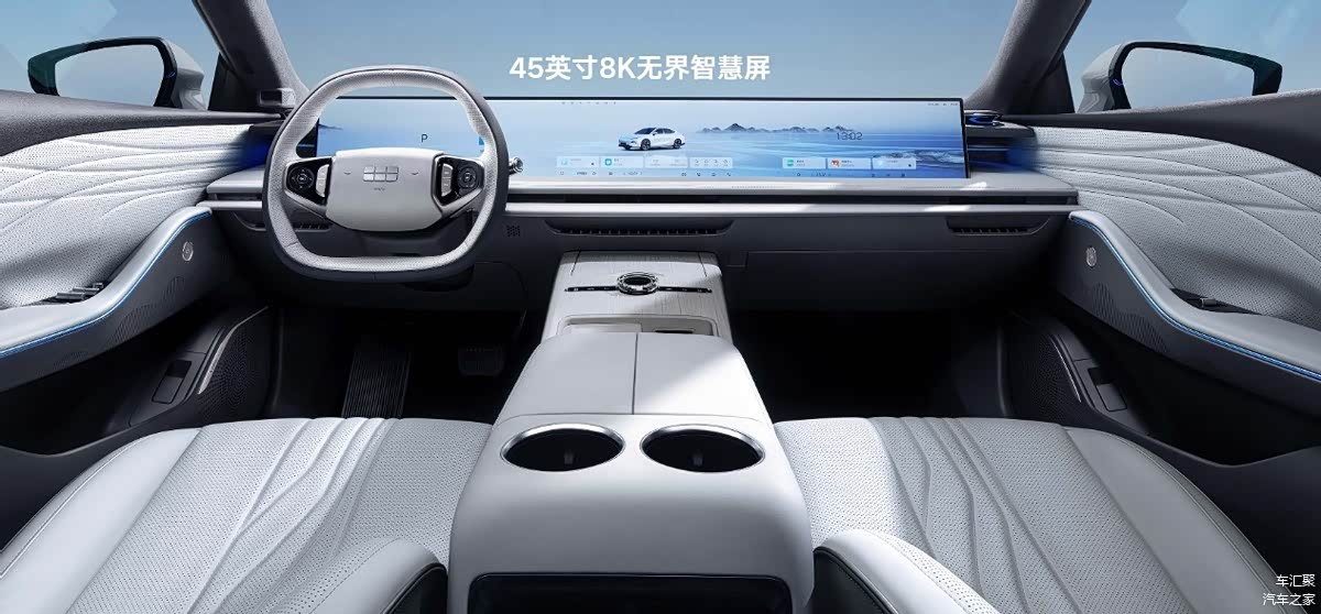 中控台与车门板衔接流畅,羽翼式缝线精致细腻,台面分层式台阶结构搭配隐藏式出风口,简洁大气。45英寸超大整体联屏分辨率高达7680*936,搭配骁龙8295+24GB系统内存的强大硬件配置,以及功能丰富的银河NOS车机系统,不仅具备常见的GPS、多媒体娱乐、Hicar和原厂互联功能,还支持4G/5G网络与OTA升级,让车辆始终与科技前沿同步。