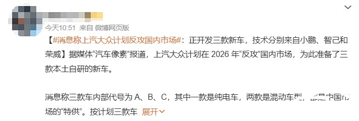 消息表示:这三款新车是大众专门为中国消费者打造的“特供”车型,内部代号分别为A、B、C。