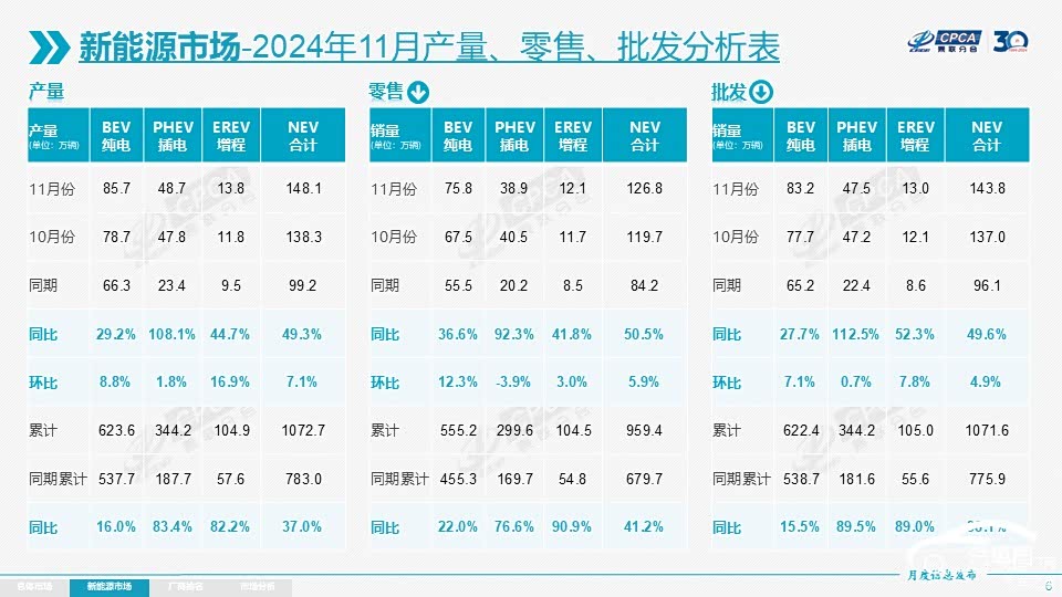 来自乘联会的数据显示:2024年11月,纯电动汽车的批发销量达83.2万辆,同比增长27.7%;狭义插混批发销量达47.5万辆,同比显著上涨112.5%;增程式的批发销量则达13万辆,同比上涨了52.3%。