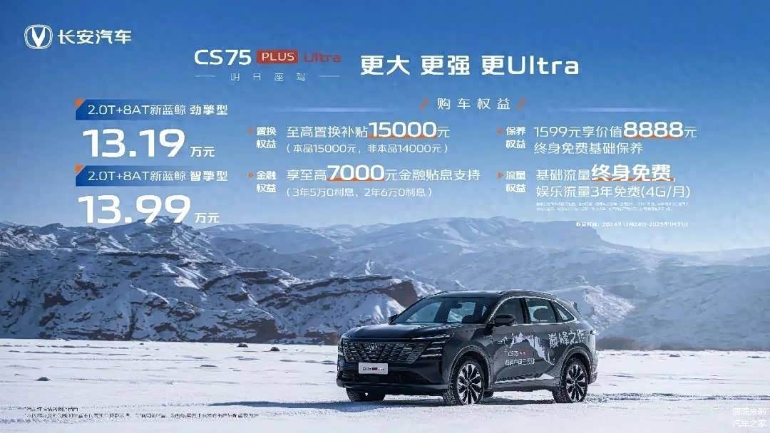 近日,长安第四代CS75 PLUS Ultra正式上市,共推出2款车型,劲擎型13.19万元,智擎型13.99万元。新车定位为紧凑型SUV,采用新蓝鲸2.0T高压直喷发动机。