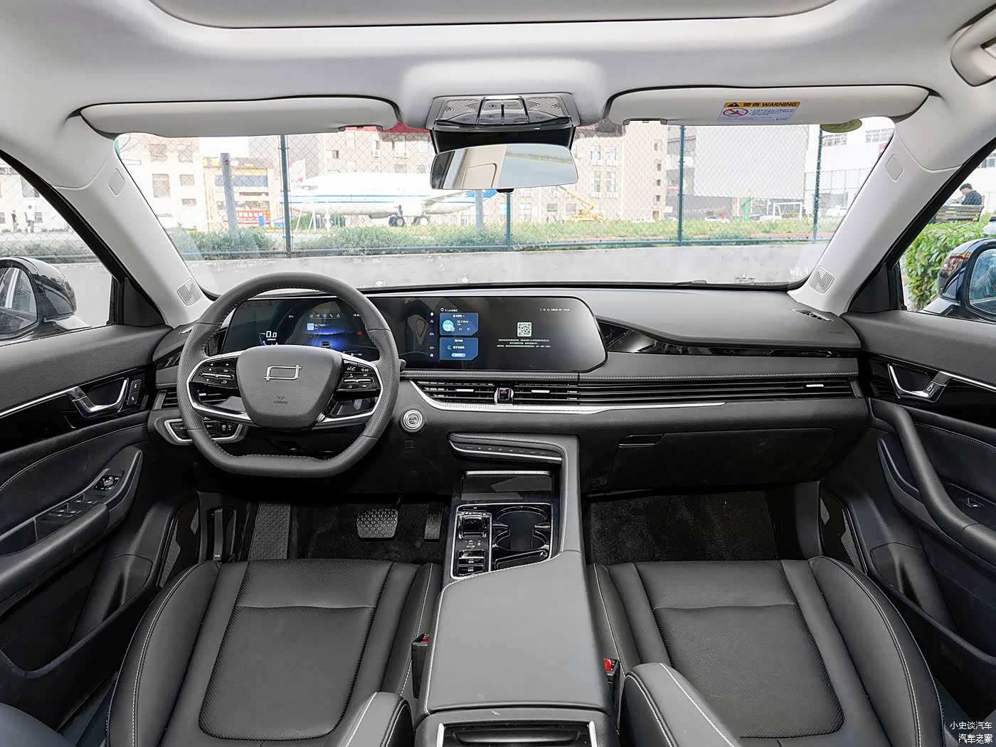 进入车内,新车宽厚的中控台向驾驶员一侧倾斜,悬浮式的液晶仪表与中控大屏连接,形成了贯穿式的一体式大屏,增加着不错的科技感,下方空调出风口为贯穿式设计,底部还有着镀铬饰条镶嵌设计,增加了视觉宽度以及精致感,双幅式的平底式多功能方向盘手感出色,一侧的拨杆式挡把结合物理按键的设计,操作起来也是方便快捷,宽厚的座椅两侧可以看到有着突出明显的包覆感设计,乘坐起来也很舒适。