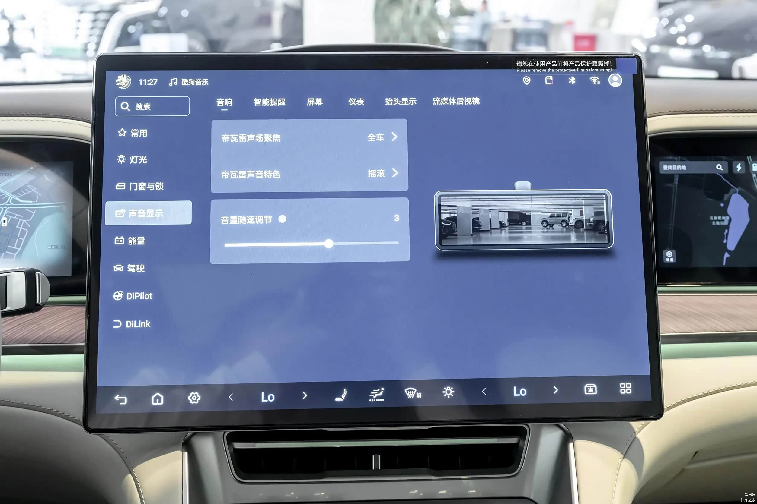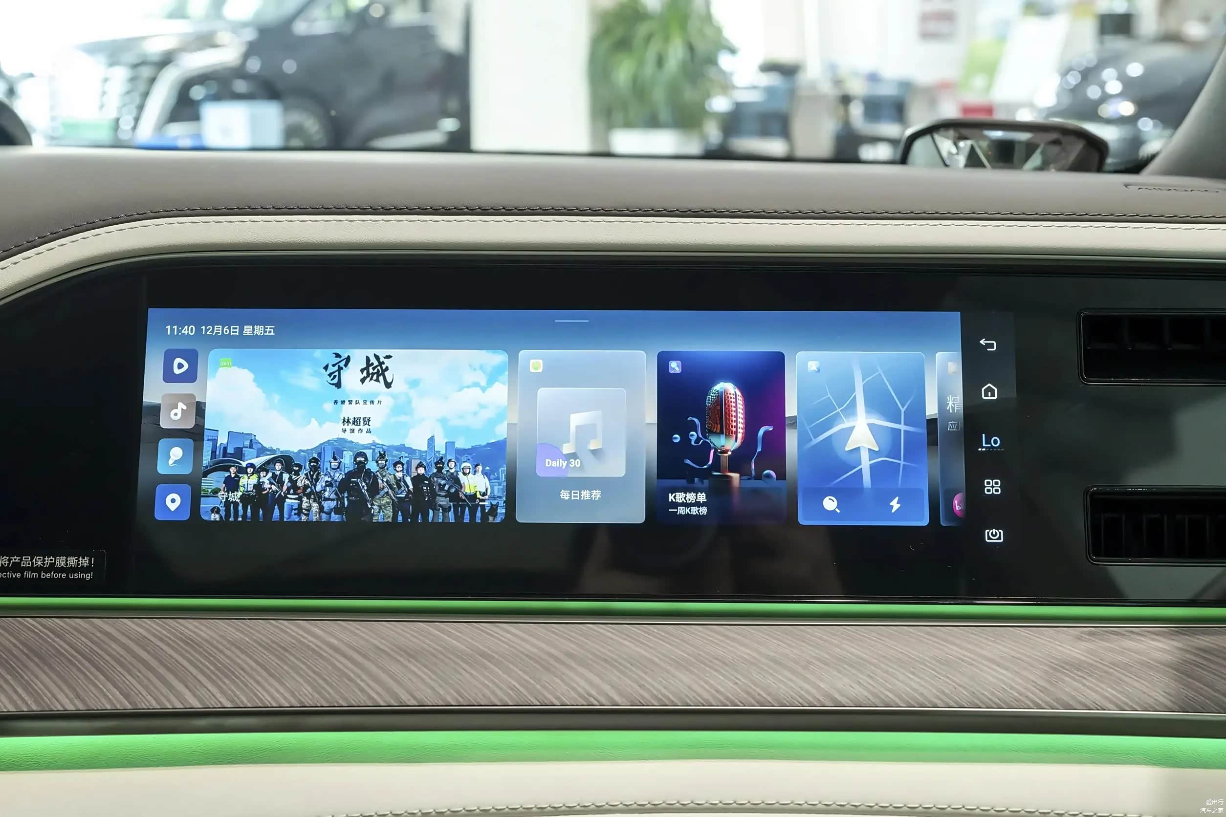 在科技配置方面,腾势Z9同样不遗余力。车辆配备了13.2英寸液晶仪表、50英寸AR-HUD抬头数字显示、17.3英寸中控屏以及13.2英寸副驾娱乐屏,科技氛围十分浓郁。屏幕的分辨率均达到了2.5K水平,搭载了DiLink车载系统,并内置了BYD 9000芯片。实际体验下来,无论是看电影、追剧还是刷抖音等应用,车机运行都流畅稳定。连续下达多个语音指令后,语音助手也能快速准确地完成响应。