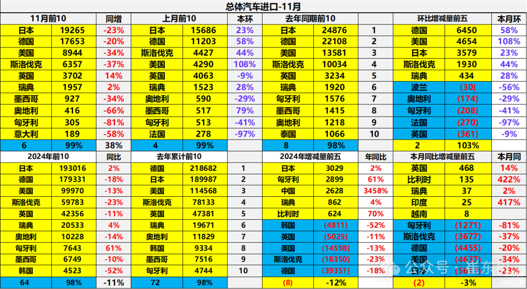 将时间拉长至今年前11月来看,销量前三名依然是日本、德国、美国三大国别,进口销量分别为19.30万辆、17.93万辆、10.00万辆,但仅日本国别实现同比微涨2%,后两者分别同比下滑18%、13%。斯洛伐克、英国分别同比下滑23%和11%,进口销量分别为5.98万辆和4.24万辆。此外,榜单前十中出现同比下滑的还包括奥地利、墨西哥、韩国,而瑞典和匈牙利则实现同比增长,分别增长4%和61%,进口销量分别为2.05万辆和0.76万辆。