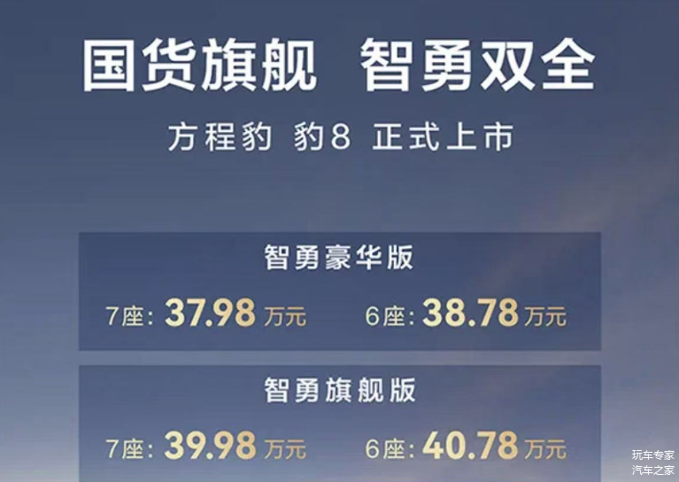 11月12日,比亚迪华为联合发布了 豹8(图片 | 参数 | 询价),共发布4个款型,其中,智勇旗舰六座版40.78万元、智勇旗舰七座版39.98万元;智勇豪华六座版38.78万元、智勇豪华七座版37.98万元。