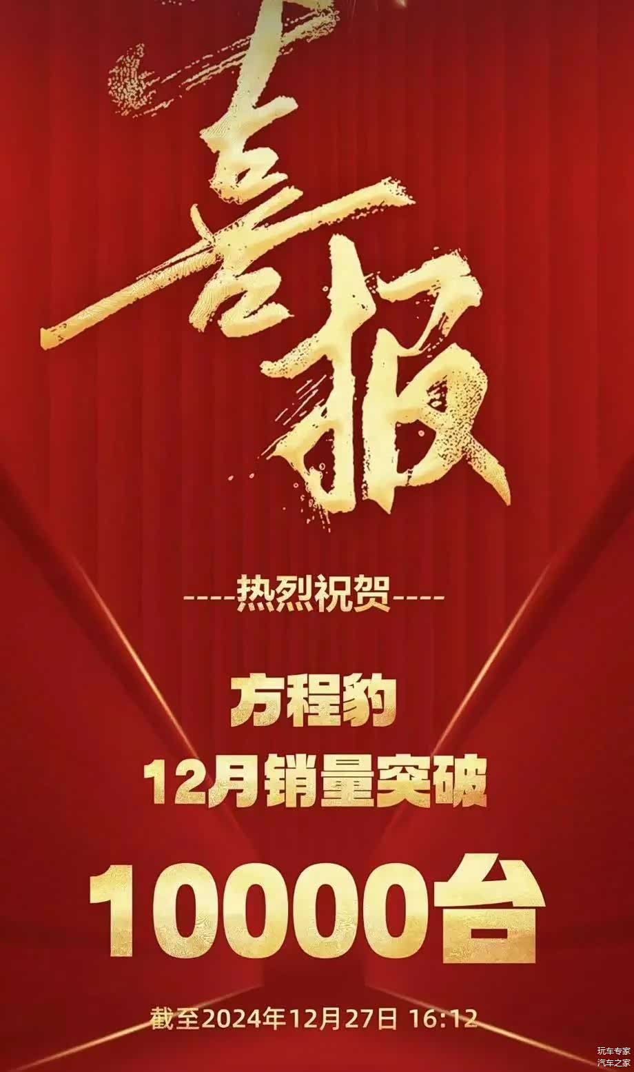 12月27日,方程豹官方再发喜报,截至2024年12月27日16:12,方程豹12月份销量突破10000台,创历史销量纪录,也是方程豹首次迈入万辆俱乐部,值得恭喜。