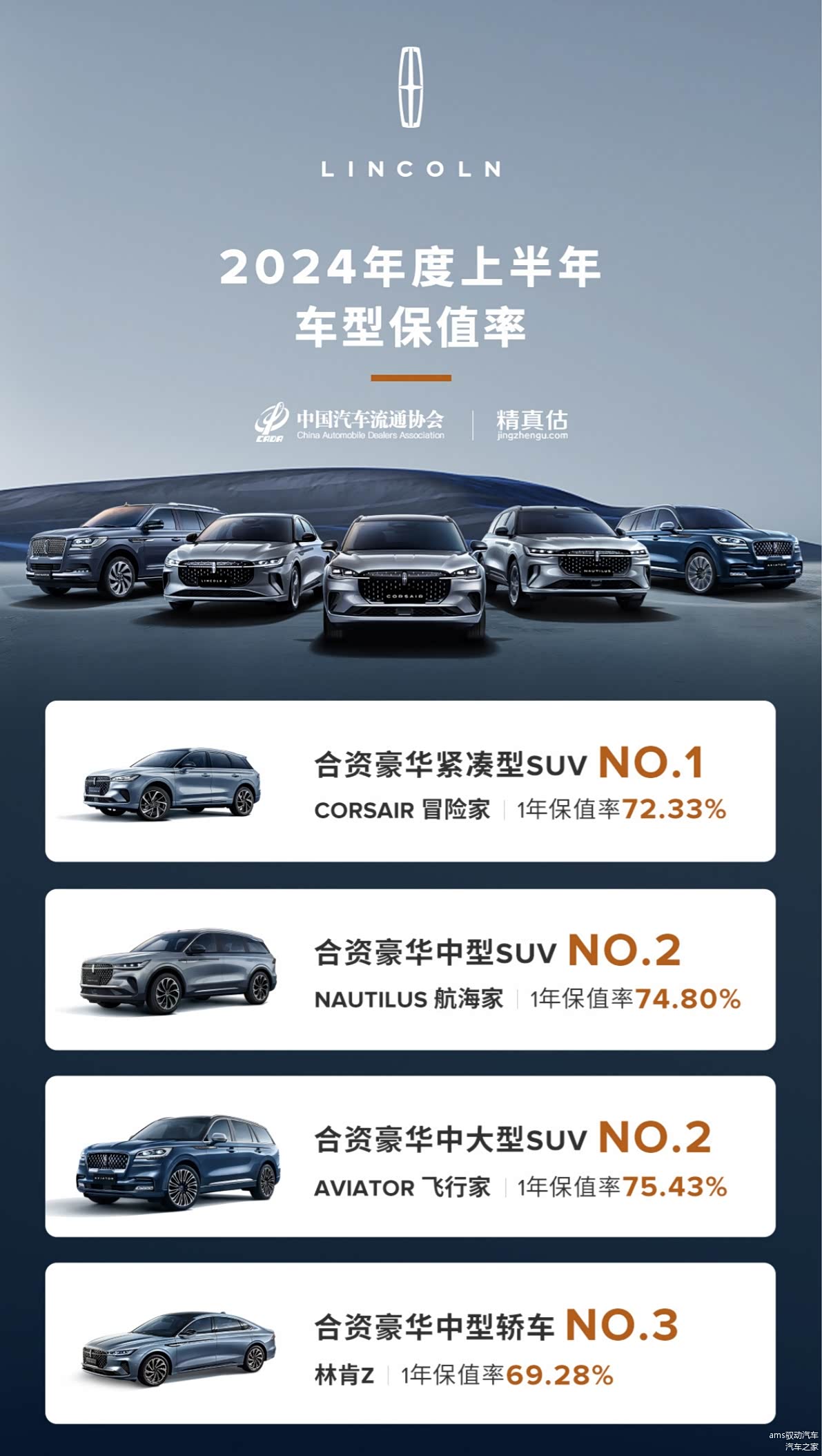 当然,决策消费者购车选择的因素,除了品牌影响力、车型实力、服务体验之外,保值率也成为衡量一个品牌、一款车型价值的重要指标,也受到越来越多消费者的重视。参考中国汽车流通协会和精真估联合发布的《2024年度上半年中国汽车保值率研究报告》,林肯品牌凭借其卓越品质、创新设计以及个性化的尊贵服务体验,摘得美系品牌保值率冠军,三年保值率高达 57.58%,旗下三款明星SUV车型以及林肯Z均以优异的表现傲居各自细分市场一年保值率排名前三,足以印证其被市场认可的产品价值,更是一种对品牌坚持的回报。