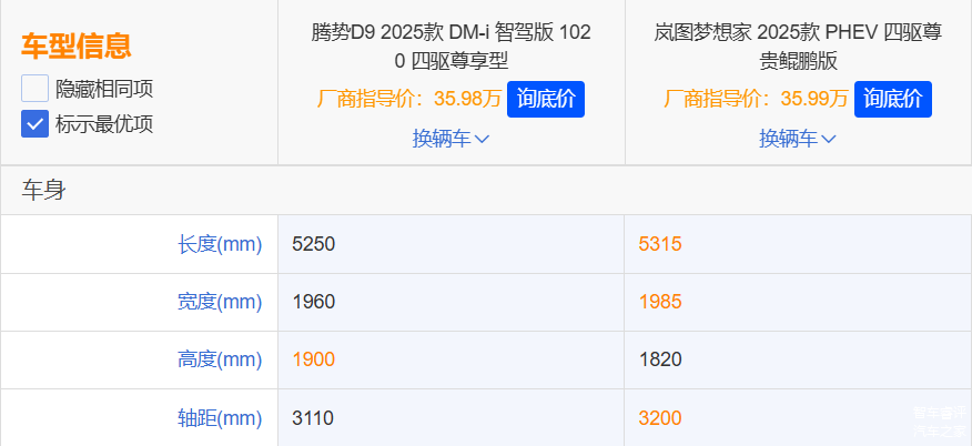 那么,对于家庭用户来说,到底腾势D9还是岚图梦想家更值得购买呢?正好2025款腾势D9刚刚上市,我们不妨以指导价35.98万的腾势D9 2025款DM-i智驾版1020四驱尊享型(下文“腾势D9”不做特别说明均指这个配置的车型)和指导价35.99万的岚图梦想家2025款PHEV四驱尊贵鲲鹏版(下文“岚图梦想家”不做特别说明均指这个配置的车型)来简单对比一下。