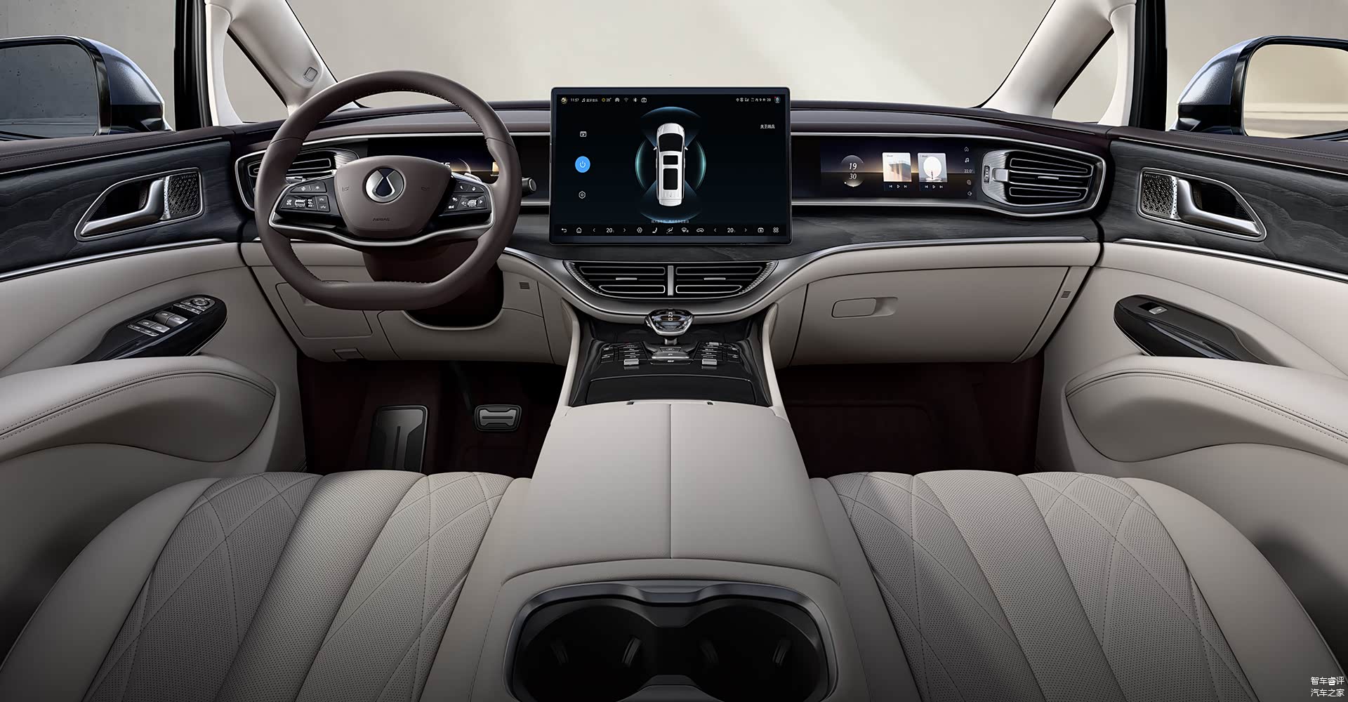 岚图梦想家的内饰稍有不同。前排采用的是15.4英寸的双联屏,而后排是一块17.3英寸的折叠屏,对车内乘客的娱乐要求满足得更多。与腾势D9相比,岚图梦想家同样提供了车载冰箱,不过采用的不是品牌音响,也没有配备ETC装置,但是配备了29英寸的HUD。