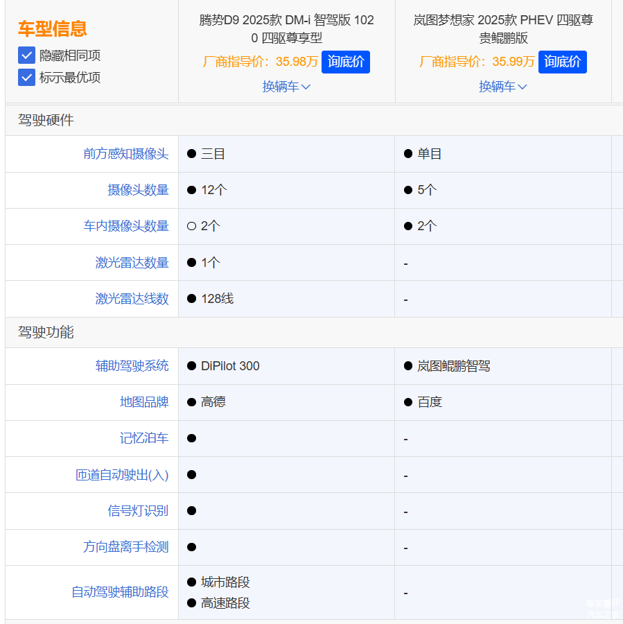在智驾方面,很显然腾势D9的优势比较明显,如果对车辆的智驾能要求较高,那么在这个价位可能就只能选择腾势D9了,否则就得加钱购买岚图梦想家的高配版本。