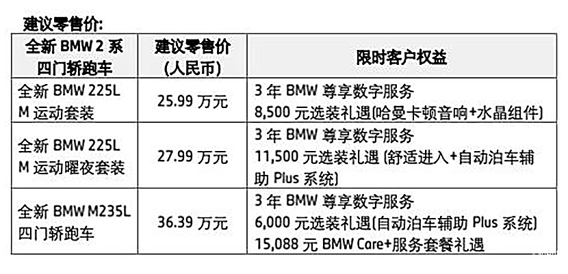 M235L四门轿跑版倒是有221k的最大功率,但是其采用的还是xDrvie四驱系统,用七挡湿式双离合变速器。进口宝马2系两门轿跑版是匹配8AT的纵置平台车辆,和华晨宝马M235L是完全不同的,车辆的可玩性也不一样。这个版本无非是百公里加速可以达到5.0秒,但是36.99万元的指导价会有很大的吸引力吗?笔者认为吸引力不会很大。
