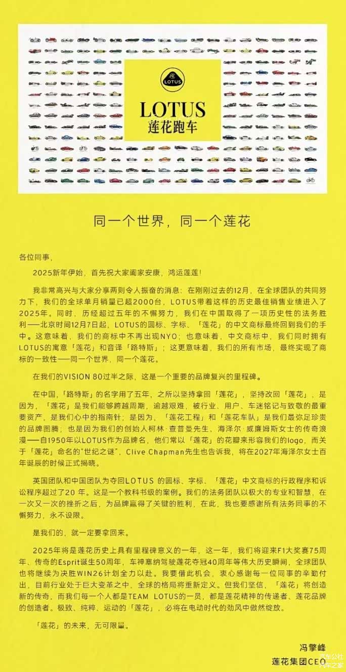 在莲花集团CEO冯擎峰的内部信里也可以看到,其称之为这场商标之争是一个教科书级的案例,英国团队和中国团队为夺回LOTUS 的圆标、字标、“莲花”中文商标的行政程序和诉讼程序超过了20年。