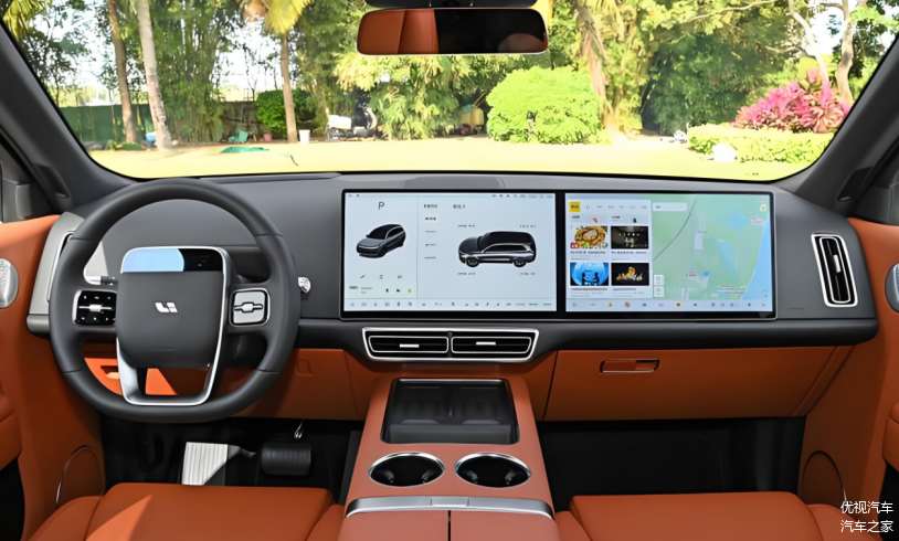内饰也被曝光了出来,整体采用了和理想L系列车型所相类似的中控、副驾一体屏,驾驶位前方则配备了一块小的长条形仪表。另外,实拍车型内饰配色选用了比较温馨的橙色调,这难道也是在致敬理想?