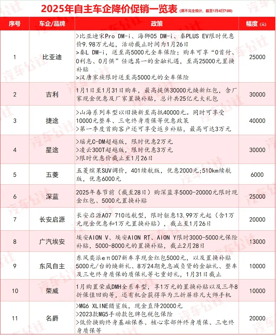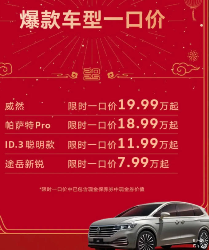 上汽大众:即日起至2025年1月28日,2025款上汽大众朗逸新锐限时价为6.98万元起,2024款朗逸推出限时价为8.38万元起(该价格适用于按揭方式),并可享动力总成终身质保等权益。另外,威然限时一口价19.99万元起,途岳新锐7.99万元起,帕萨特Pro18.99万元起。一汽大众:宝来、迈腾200万辆众享款、探岳三款车型推出限时价优惠,分别为7.98万元起13.98万元起,此外部分车型可享以旧换新厂家补贴最高1.6万元、0首付/落地价日供最低56元起金融方案。活动期限为即日起至1月27日,参与条件详询当地一汽-大众经销商。