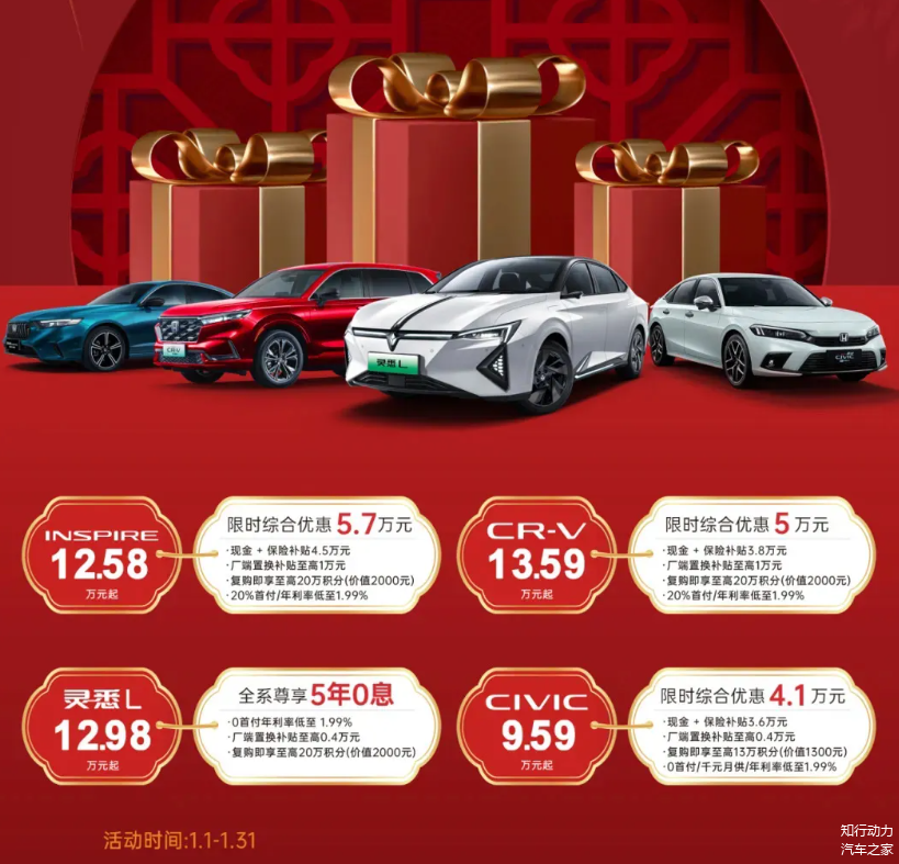 东风本田:即日起至1月31日,购买灵悉L、CR-V、英仕派、思域车型可享限时优惠政策,包含现金+保险补贴、厂家置换补贴、金融政策、积分赠送等。购买东风本田CR-V车型,可享限时售价13.59万元起。购买东风本田英仕派车型,可享限时售价12.58万元起。购买东风本田思域车型,可享限时售价9.59万元起。长安马自达:购买CX-5 2.0升舒适型限时11.58万元起(原指导价为12.58万元);购买昂克赛拉2.0升自动挡车型可享限时售价8.99万元起(2.0升自动挡车型指导价格为9.99万元起);购买CX-50行也2.5升车型限时售价15.88万元起(2.5升车型指导价17.58万元起)