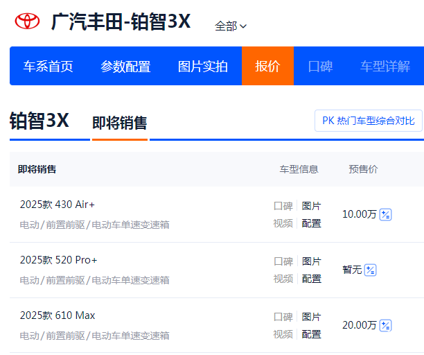 根据不同配置版本,铂智3X的预售价区间为10万至20万元,其中430 Air+版的预售价为10万元。