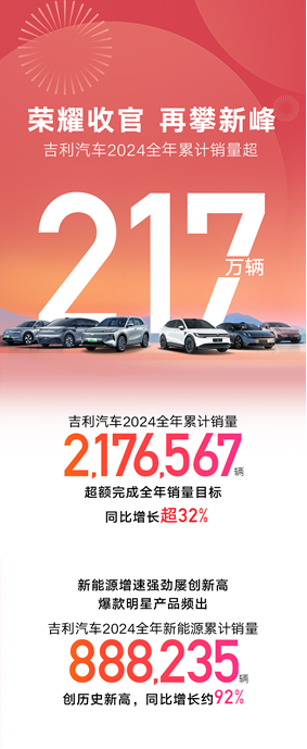 “吉利将坚定秉承智能精品车路线,从底层技术出发,继续挑战物理极限,打造高价值的产品,引领新能源汽车迈入品质新时代。”淦家阅表示,2025年吉利的销售目标是271万台,其中新能源车为150万台。