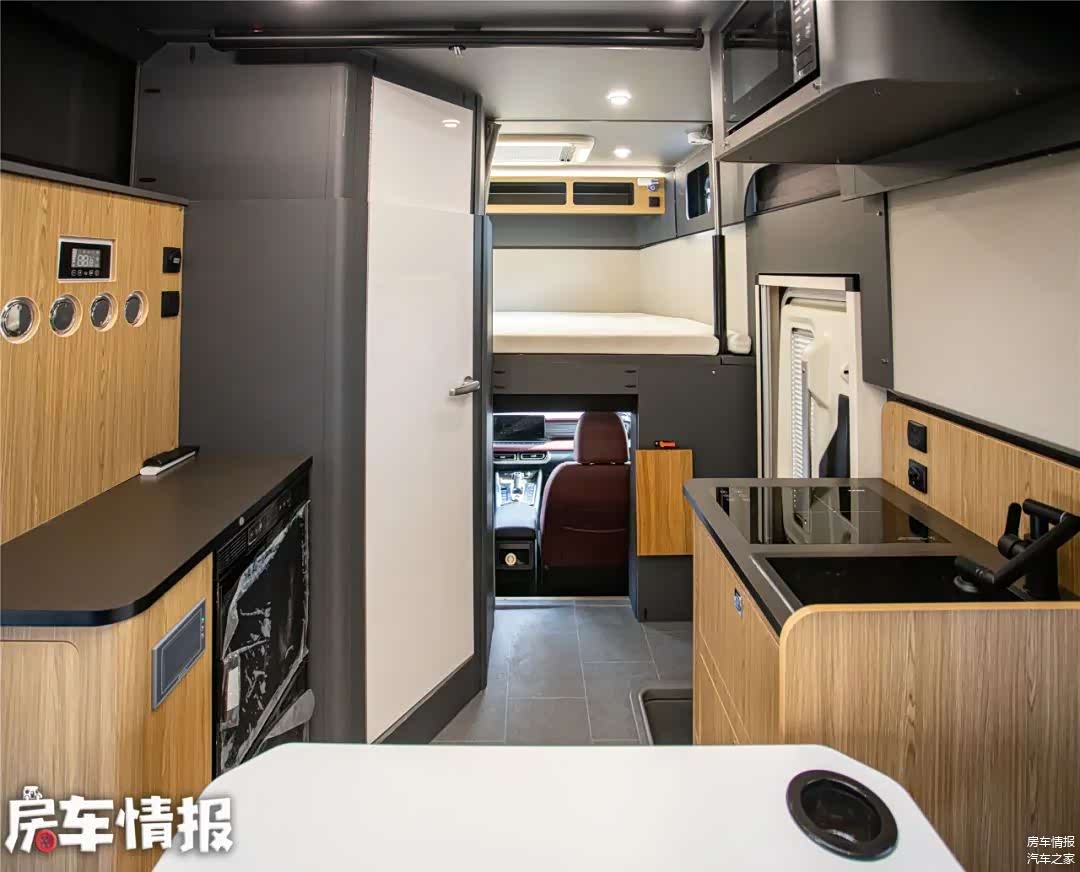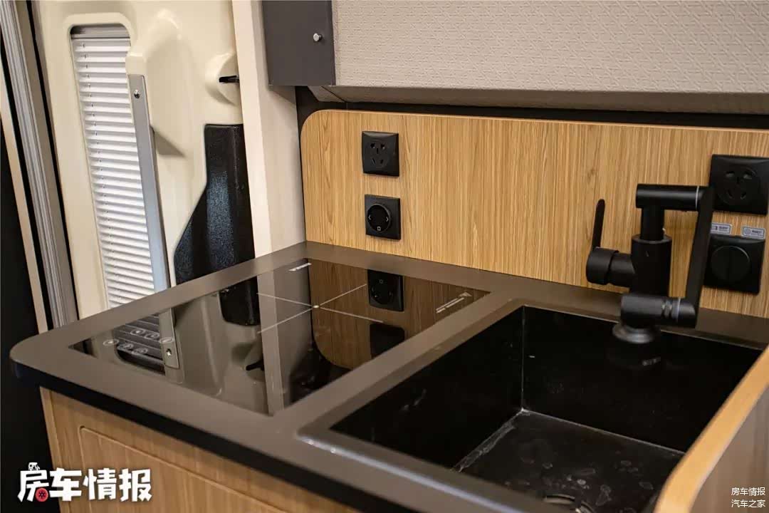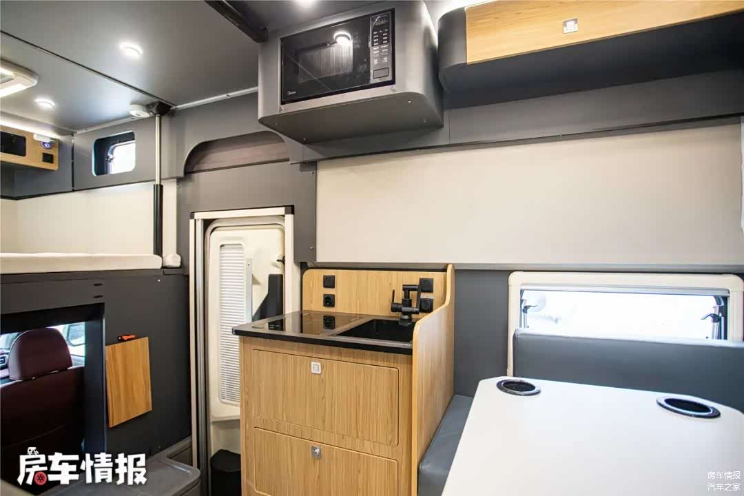 车厢中部提供了一组厨房设备,有电磁炉、洗菜池、微波炉、房车专用冰箱等,基本上可以满足日常的使用所需。