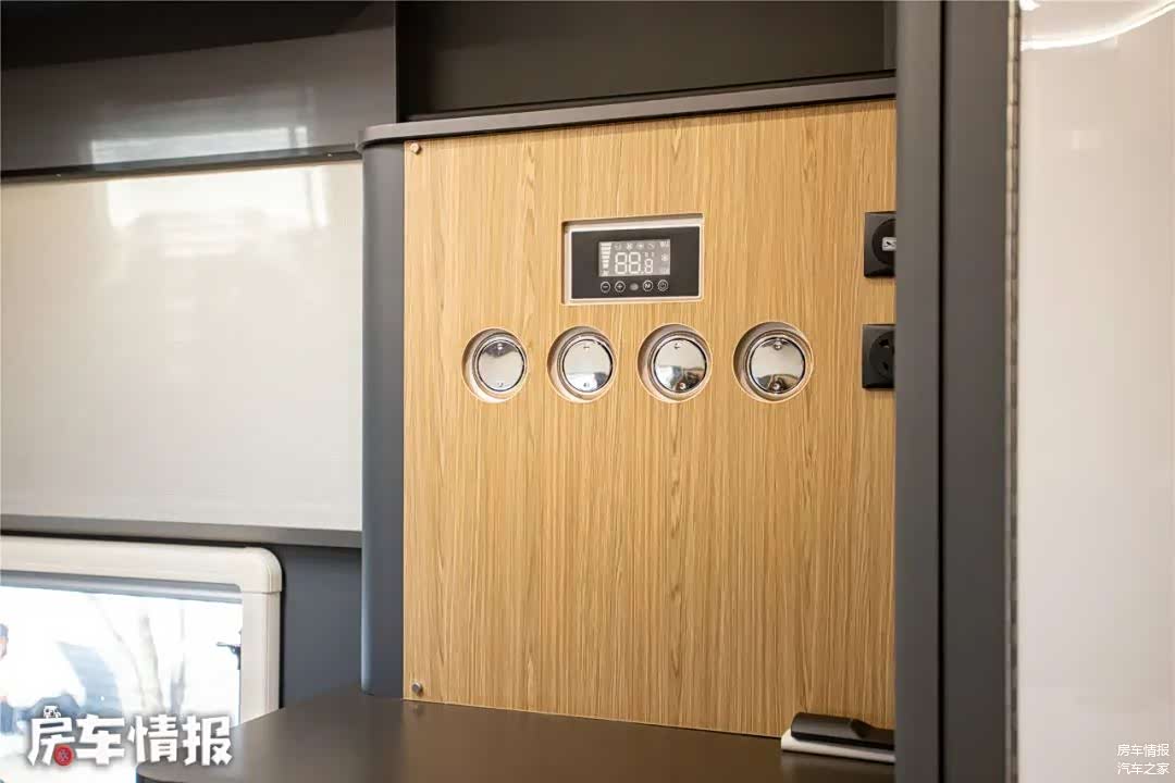 车内空调采用了48伏底置空调,整台空调机被板材包覆,仅留下出风口以及控制面板,看起来一体性还挺不错。
