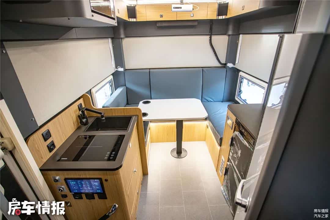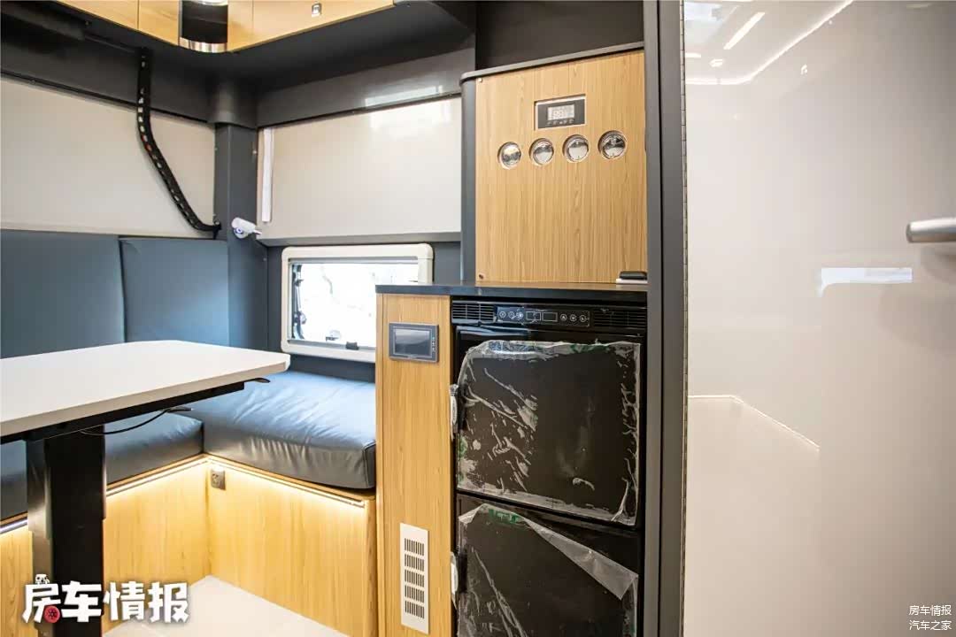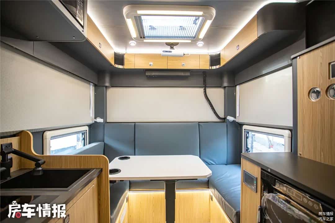 生活区的设计相对就要常规一些,升起车顶以后,内部高度可以达到了1.95米,成年人也可以轻松站立。车内墙壁采用了软质包覆,质感挺不错。