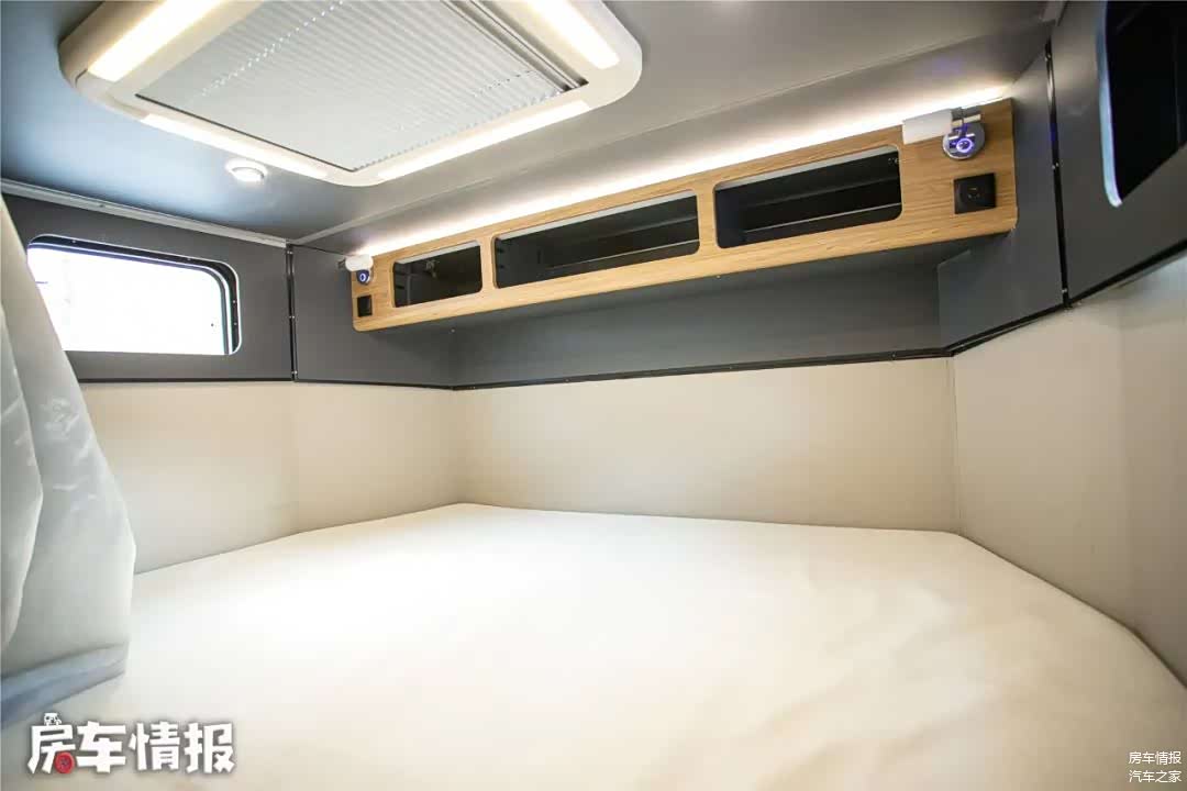 车内的另一张床铺是驾驶室上方的头床,尺寸为1米9米*1米5,尺寸已经和家里的标准双人床相当,睡下两个成年人也很轻松,且额头床的垂直高度达到了90公分,在这里休息完全没有压抑感,甚至可以在床上坐直。