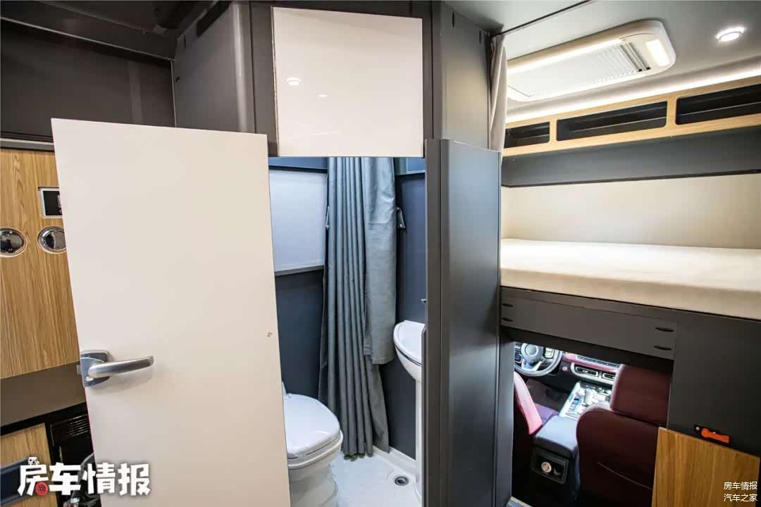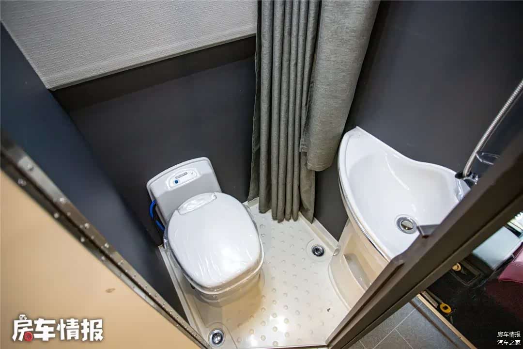 车内的卫生间设计的也挺实用,并不是像其他升顶房车那样,采用的软帘子,而是采用了固定柜门的设计,虽然空间没有常规C型房车那么大,但日常使用不用担心把水弄得到处都是。
