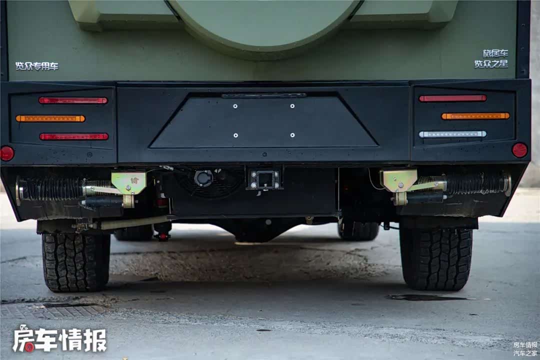 车尾部提供了外挂式行李箱,实拍车型采用的是一体式的机甲背包,后续也可以选择分体式的储物箱,个人感觉分体式的储物箱更实用和美观;车尾下方还提供了拖车方口,这款车拥有牵引资质,可以选装电动驻车支腿。