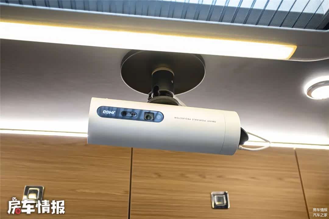 沙发上方还提供了一组环形储物吊柜,能够存放一些随身的小零碎,这点是很多升降顶房车所不具备的;同时也可以看到车内的投影仪也设置在了这里。
