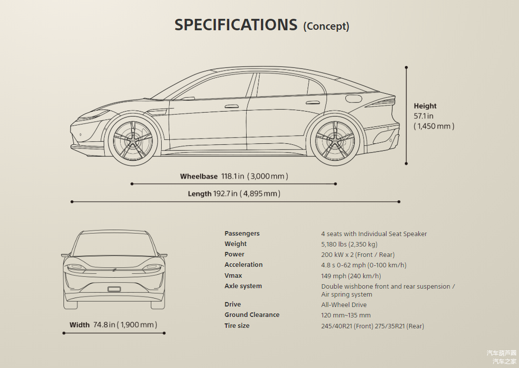 在动力方面,Afeela 1搭载前后双电机的电动四驱系统,最大功率达到490马力,百公里加速时间不到4秒。车辆的车身长度为4.915米,轴距为3米,提供了较为宽敞的乘坐空间。电池方面,Afeela 1配备了一块91度的三元锂电池,提供约483公里的美国EPA工况续航,支持最高150kW的直流快充,大大提高了充电效率。