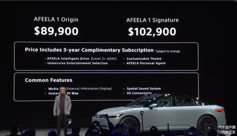 在2025年的CES展上,索尼终于带来了其首款量产电动汽车Afeela 1,并公开了其预售价。Afeela 1首推两款配置,分别是Afeela 1 Origin(起步版,售价8.99万美元)和Afeela 1 Signature(首发签名版,售价10.29万美元)。两款车型都包含三年免费的车内功能订阅服务,包括人工智能个人助理和半自动驾驶辅助系统。Signature版预计会在2026年年中开始交付,而Origin版则可能至少要等到2027年才能交付。