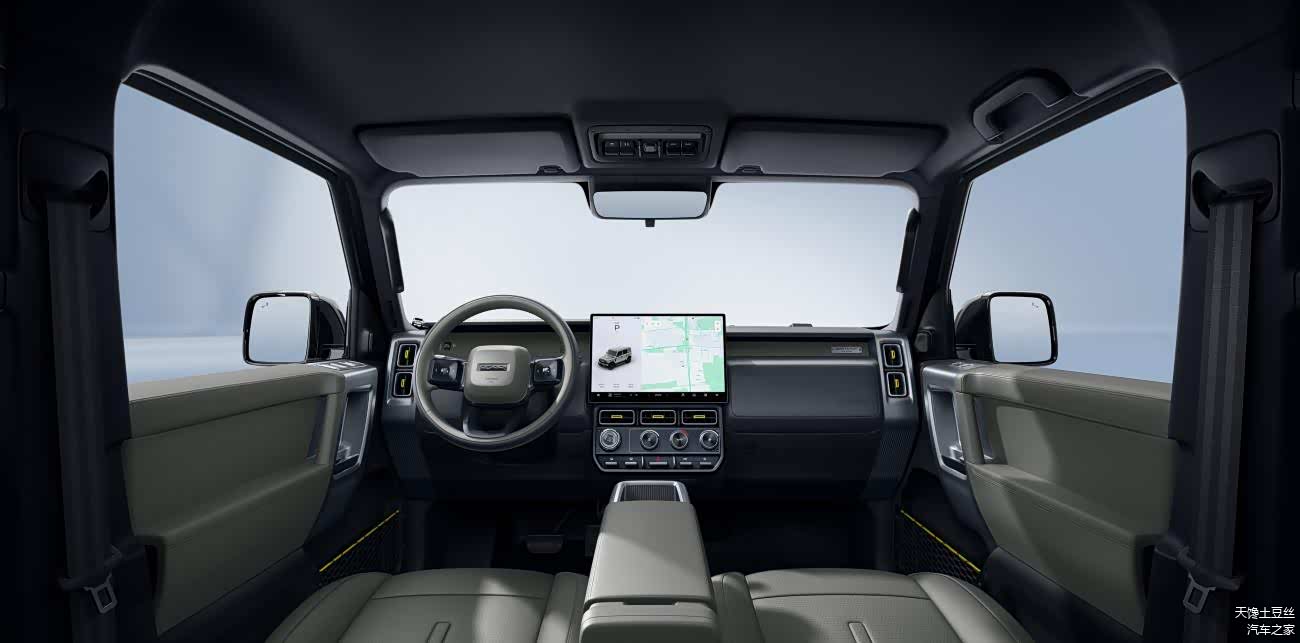 方盒子车身、圆形大灯、分体式侧踏板、C柱盲窗、外凸式轮眉、外露式前后保险杠等经典越野元素,在流线圆润为主流外观的钢筋混凝土城市里,显得阳刚硬朗、棱角分明。