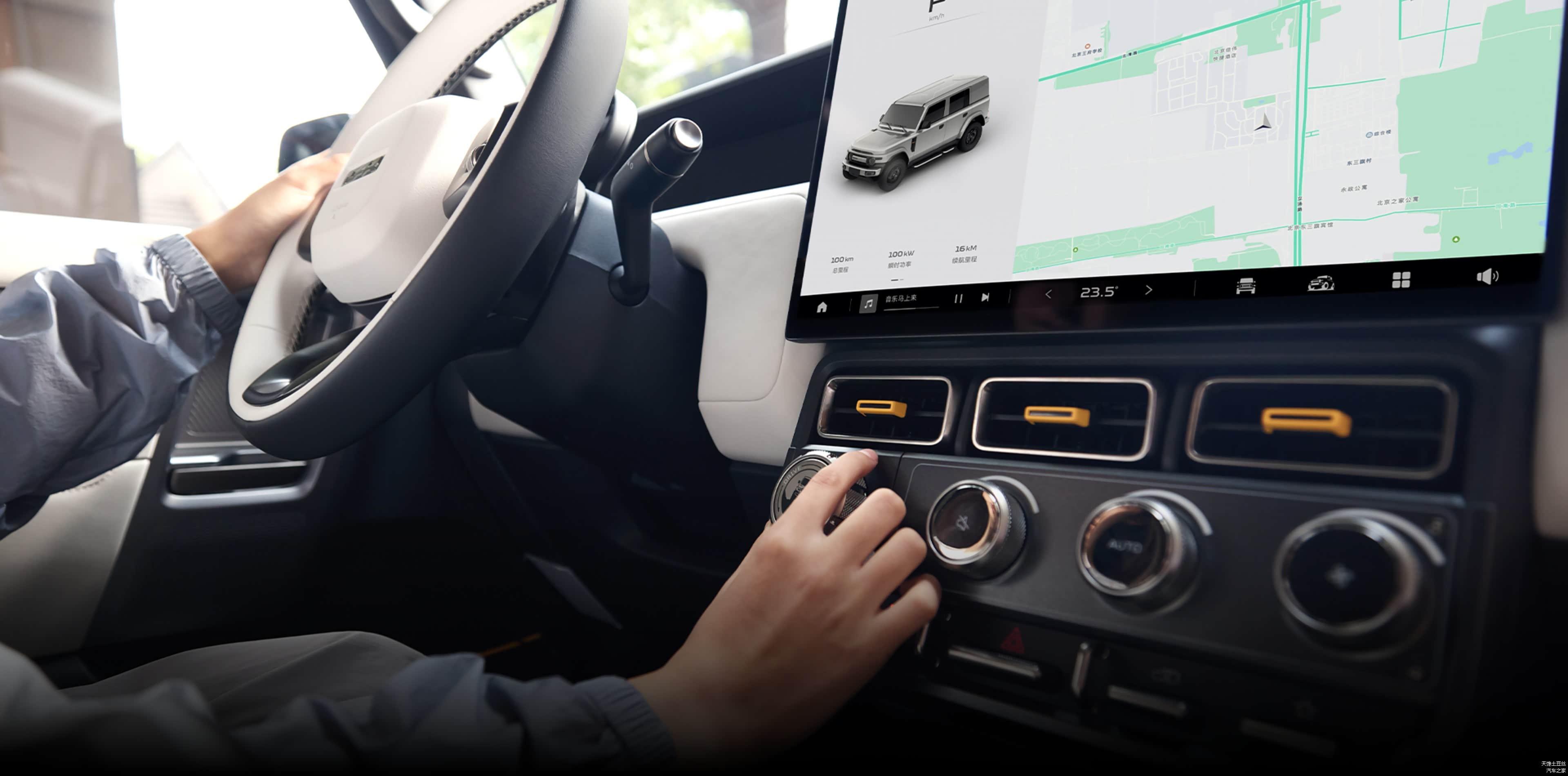 V23内饰风格是线条平直,硬桥硬马的硬朗风格,中控台相当简洁,出风口点缀了黄色装饰块,增添了几分俏皮和灵动。