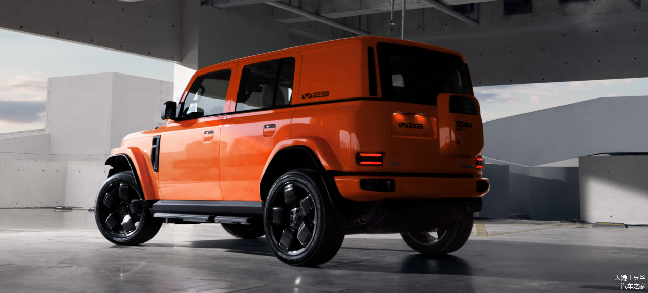 iCARV23造型方正硬朗,车身长4220mm、宽1915mm、高1845mm,近1:1的高宽比,2735mm的长轴距,配合21寸粗壮硕大的五幅式轮毂,像个高高壮壮的阳刚小伙子,粗大的臂膀要撑破衣衫,超越同级体量的强烈视觉冲击力,肌肉感爆棚。