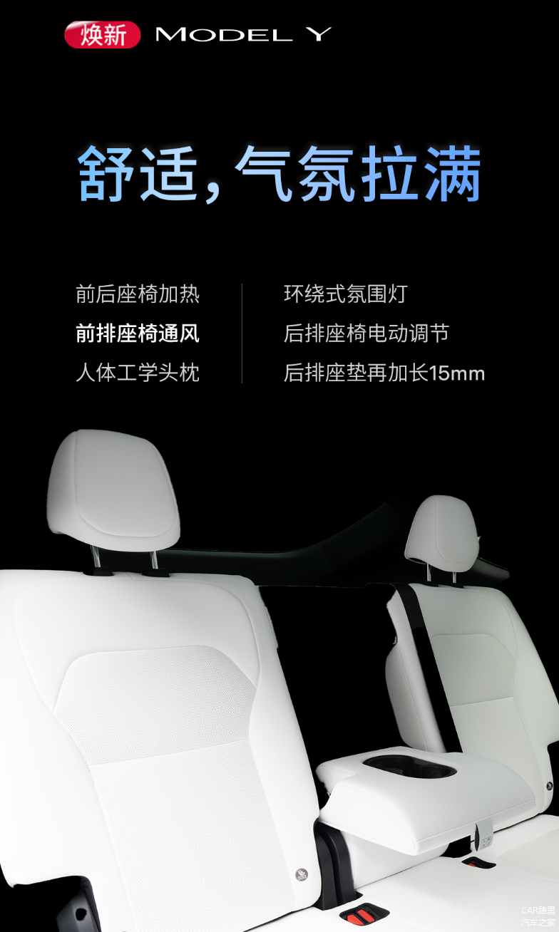 其他配置方面,焕新Model Y前排座椅增加通风、有了环绕氛围灯,并在中控屏加大到15.4英寸的同时加装8英寸后排屏,全景天窗也有镀银涂层提升防晒和隔热,后排电动放倒。更关键的是,后排座椅也加长了15mm,有了新的头枕样式,乘坐舒适性得到进一步提升。