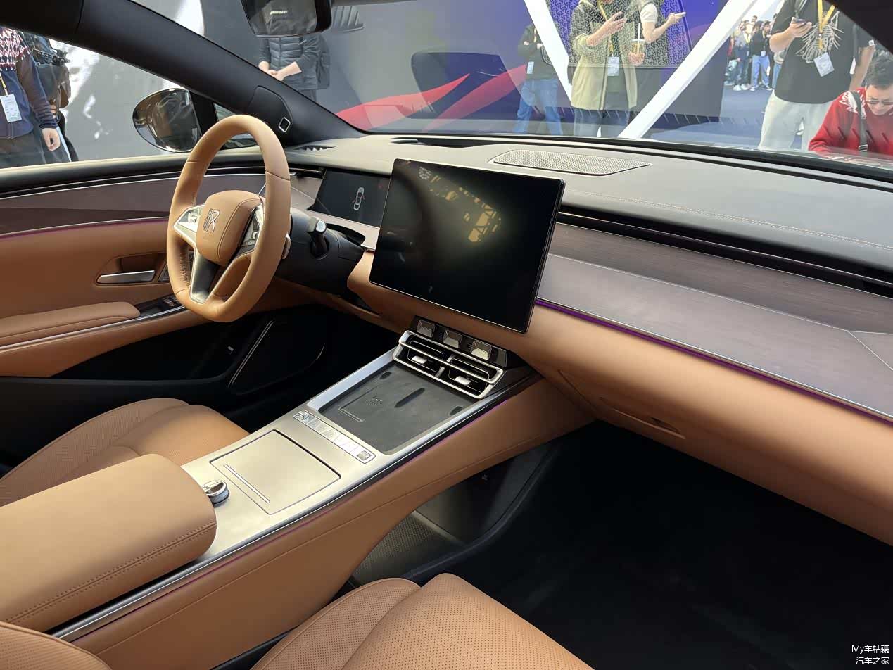 内饰还没有开放拍摄,但可以看到内部布局很简洁,实体按键的数量也很少,配备了双无线充电槽,同时带有大面积的皮质包裹。