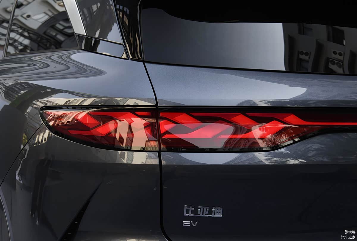 全新唐L的前脸使用了全新的设计风格,大灯为分体式结构,而且上部的日行灯也被贯穿式的银色中网格栅再分成了分体式,银色格栅下部是贯穿式灯带。前杠使用了大面积的封闭式造型,两侧带有隐藏式的远近光组,灯组下部是突出的扰流板造型,前杠底部使用了主动式的进气格栅。