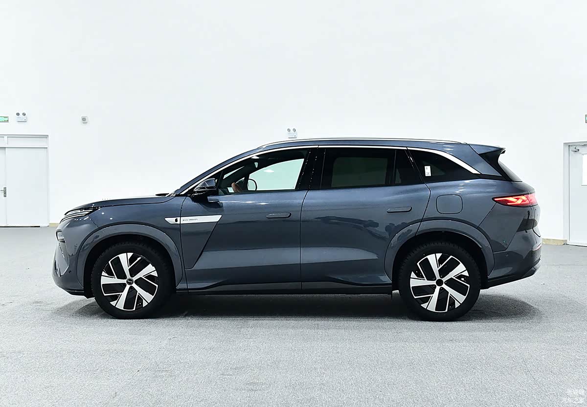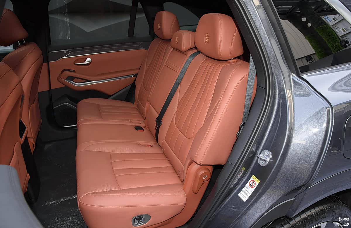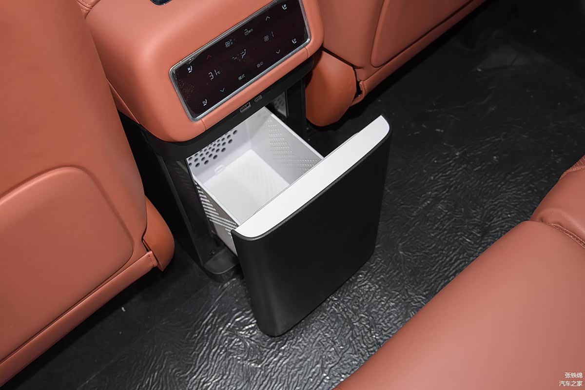 内饰也是使用了全新的设计风格,中控台线条很硬朗立体,中控面板上部很平整,中控屏后部的面板是内折线条效果,两端的音响喇叭造型和中控面板造型相呼应。新车使用了怀挡设计,副中控台区域造型很简洁干练。新车提供了前排手机无线充电、车载冷暖冰箱、香氛系统以及天神之眼智驾系统等。