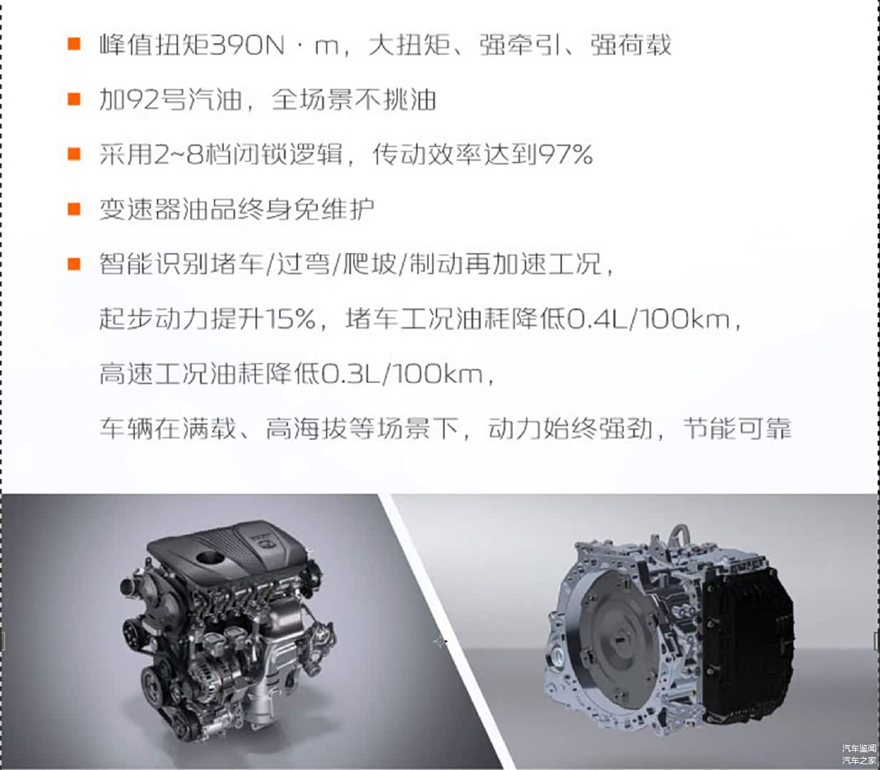 借用某车垂网站给出的两款动力的部分数据,2.0T发动机最大功率171kW,最大扭矩390N.m,零百加速7.3秒,WLTC综合油耗7.7L/100km;