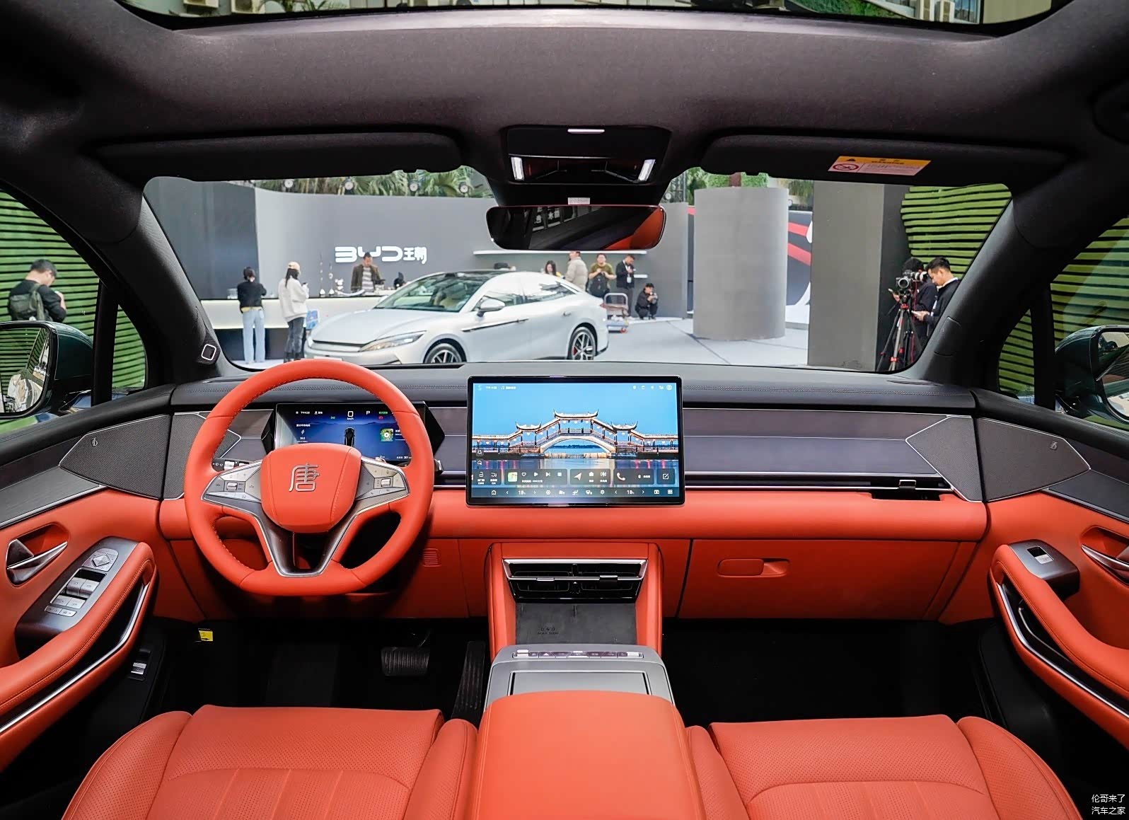 当你走进这辆新车,你会发现它的双拼色设计相当精美,此外,它还配备了一个15.6英寸的中央控制屏幕和HUD抬头显示系统。特别值得一提的是,横向和纵向的线条装饰显得非常厚重。而那平底的四幅式多功能方向盘,结合了怀挡的设计,使得驾驶和操作都变得非常便捷。此外,无线充电面板的防滑材料也非常贴心。座椅部分采用了2+3+2的七座布局,中央扶手箱内部装有车载压缩机冰箱,并且可以从后排开启。唐L在车辆的中控台和门板上采用了竹木作为材料,从而增强了车辆的整体触感。