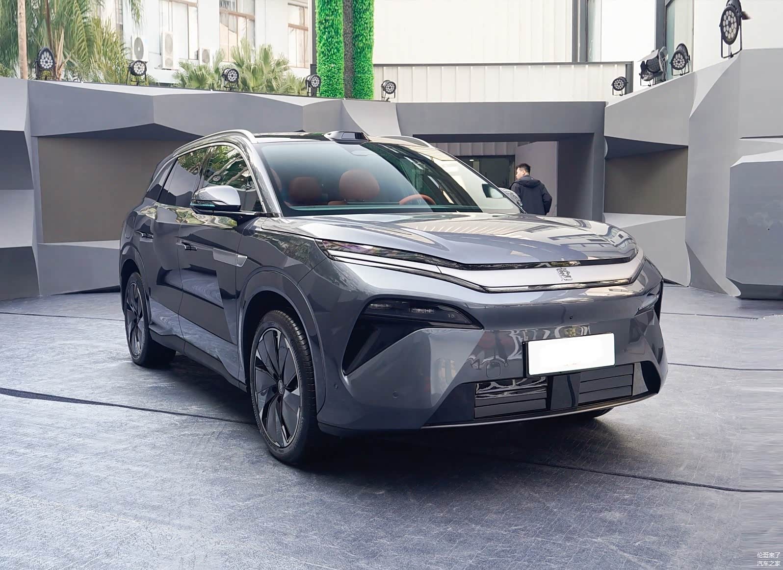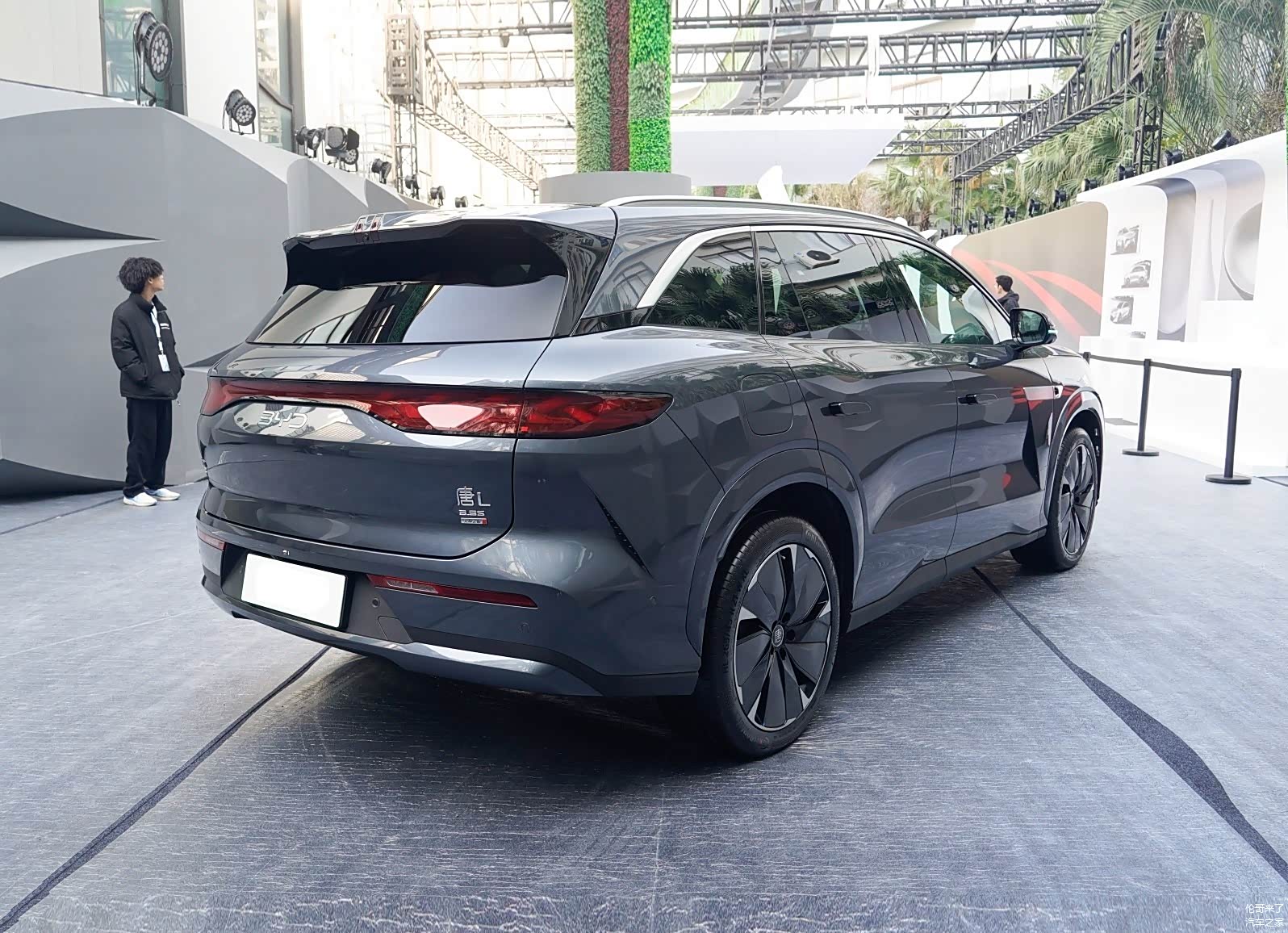 观察这款新车的侧面设计,我们可以发现其车身结构既厚实又丰满。车顶采用了明显的滑背式设计,而行李架的低矮设计与下方车窗上的镀铬饰条相结合,为车身增添了一丝精致的感觉。车窗的面积相当大,而后方的D柱上还有细长的饰条分隔,形成了悬浮式的车顶造型。车门位置的腰线既隆起又丰满,而下方的内凹设计和前门的金属色饰条的嵌入,都增强了车身的层次感。大型轮毂采用了双色封闭式设计,整体上给人一种非常出色的感觉。从车身的尺寸来看, 唐L(图片 | 参数 | 询价)的长、宽、高分别是5040/1996/1760毫米,而轴距为2950毫米。车内近三米的轴距为车内空间提供了出色的展现。