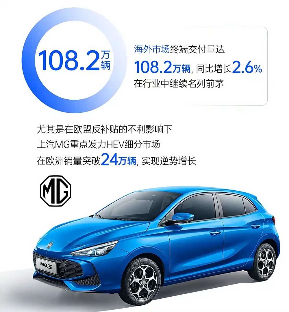 上汽集团海外销量达108.2万辆,同比增长2.6%。名爵在欧洲HEV细分市场销量突破24万辆,五菱新能源产品在印尼市场份额超40%。