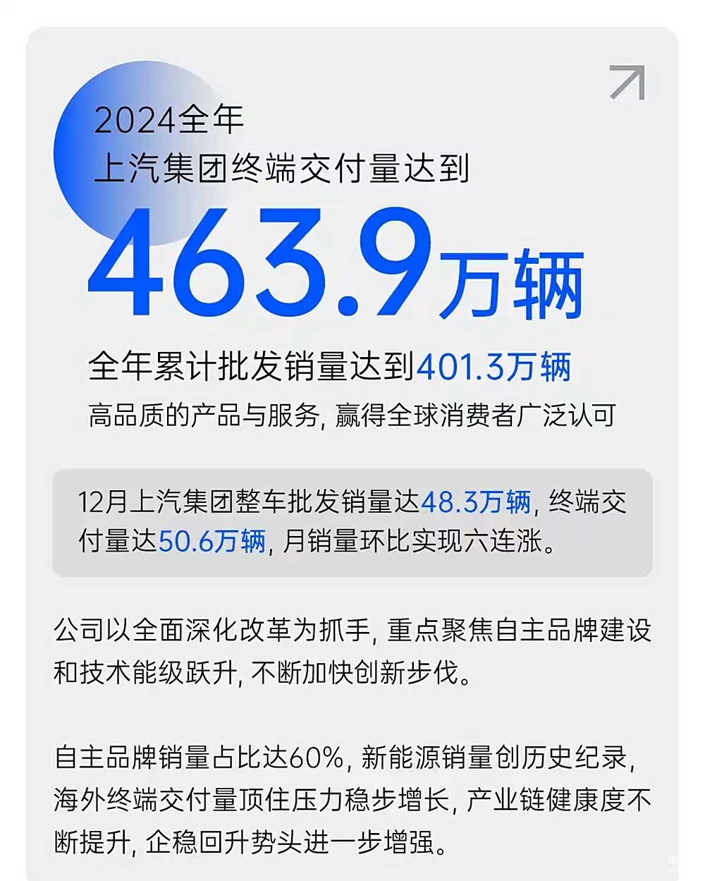上汽集团全年终端交付463.9万辆,新能源车型占比稳步提升至约30%。其中,中国品牌销量240.8万辆,同比下降13.2%,但新能源车型销量增势显著。