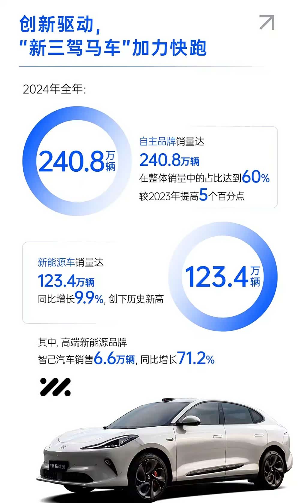 2024年,面对复杂的市场环境,上汽集团在新能源和智能化领域保持突破,总销量达240.8万辆,占整体销量60%,其中新能源车型销量123.4万辆,同比增长9.9%,创下新高。展望2025年,上汽集团将推出多款创新产品,聚焦技术升级与市场布局。
