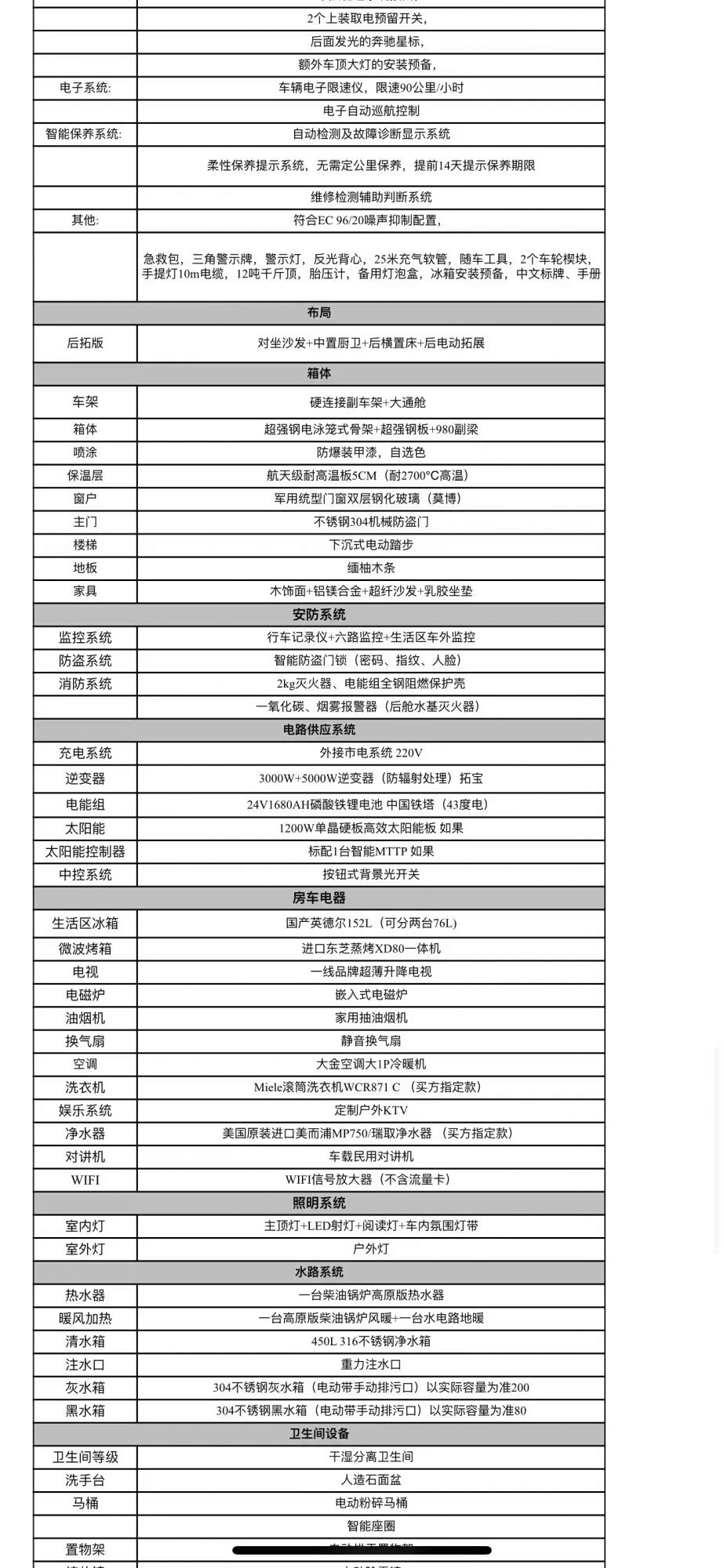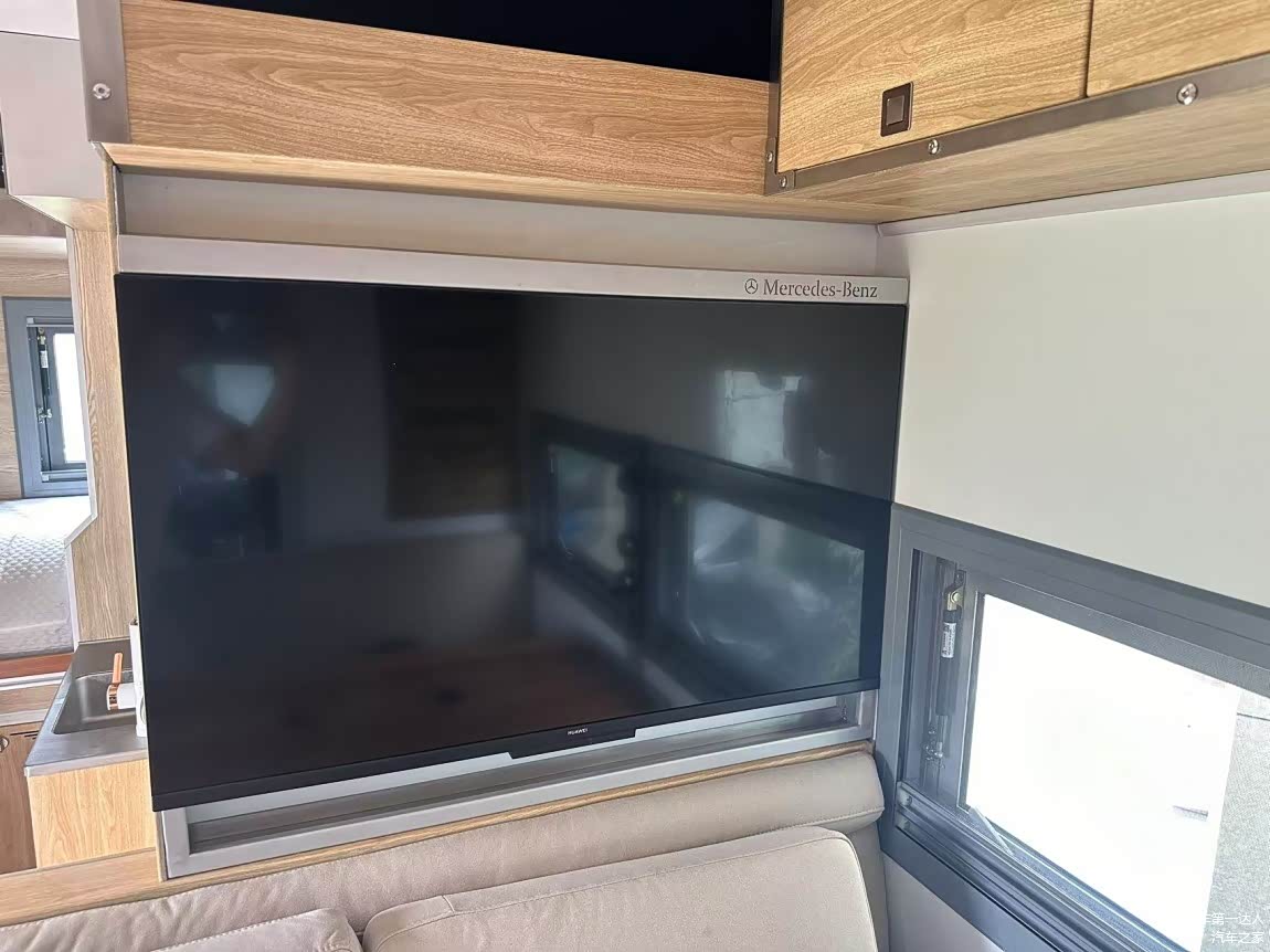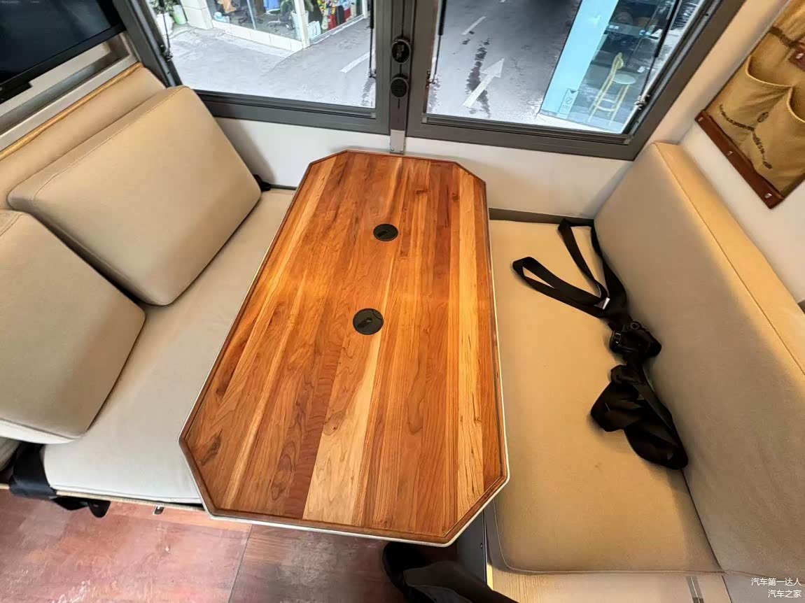 内部设施:房车专用定制四级踏步,豪华内饰配置,实木柚木储物柜面板、碗柜、鞋柜,视野宽阔。复式升顶设计,二层空间双人豪华大床及乳胶床垫,保证高质量睡眠。一层配备厨房、会客厅、卫浴间,功能齐全。
