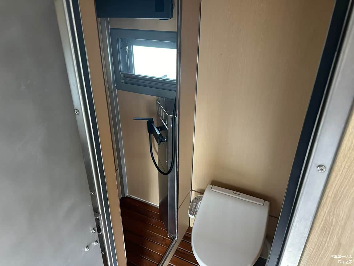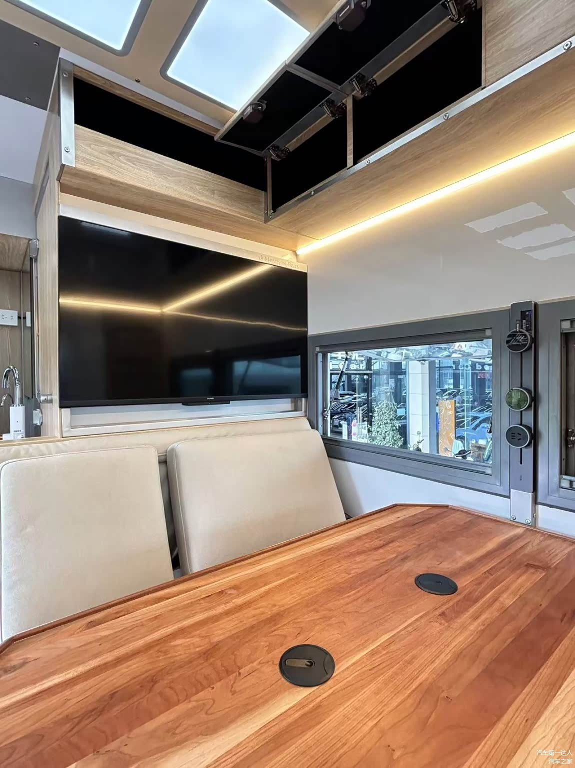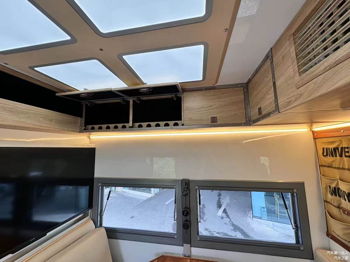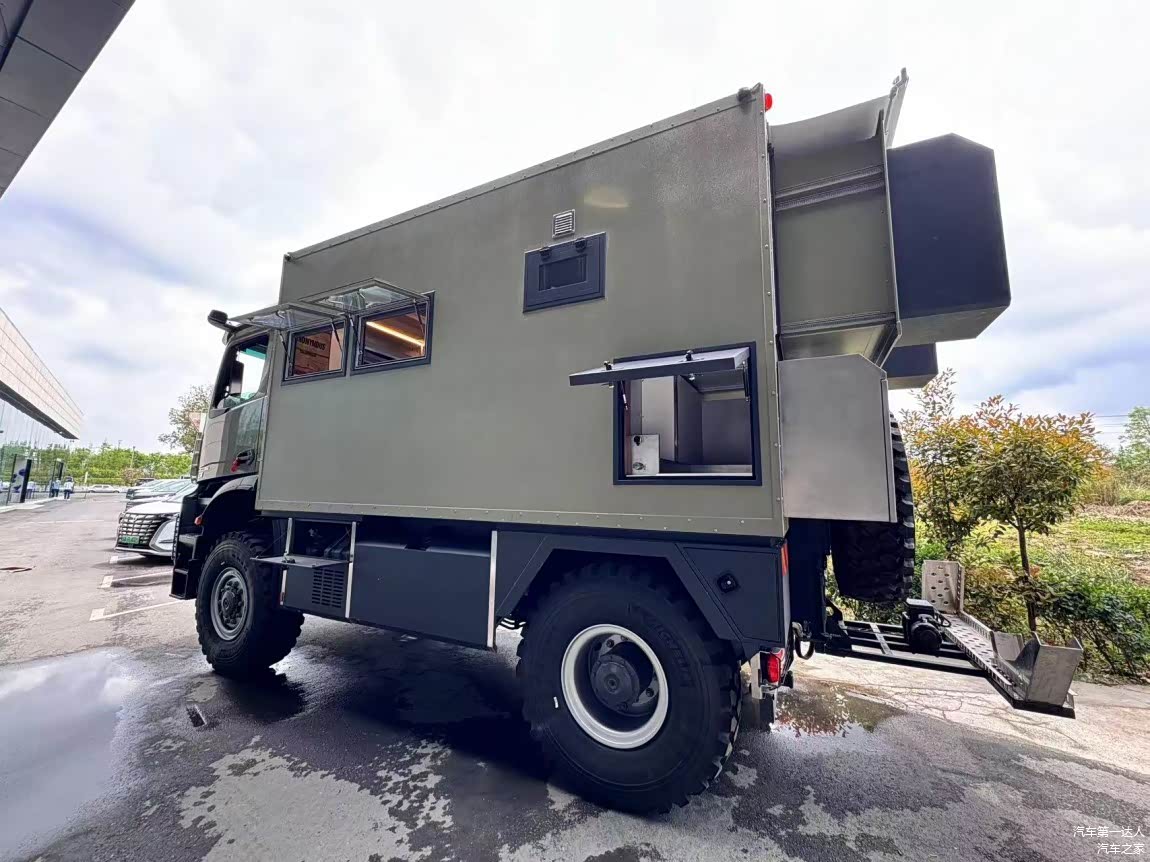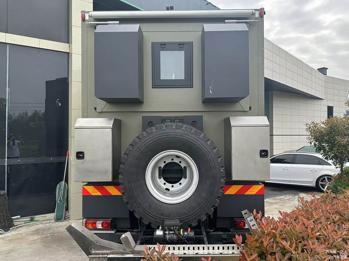 车辆为橄榄绿外观,搭配定制款越野前照灯,整体越野气息十足。车辆配置了米其林越野轮胎,保障了车辆在复杂地形中的抓地力与通过性。车身的上装部分选用的是军用级别的宿营烤漆箱体,结合笼式铝合金骨架结构及热断桥工艺+6层复合加强保温层,提供了优秀的保温效果;此外,第Ⅲ代三点式悬浮结构与橡胶隔音保温底板的应用,又进一步提升了车厢的舒适度。